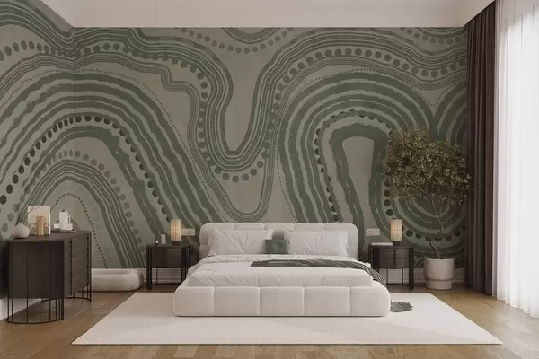 Тапете за зид Апстрактне зелене и беж таласасте линије и тачке, модерна текстурирана уметност бр. w09747