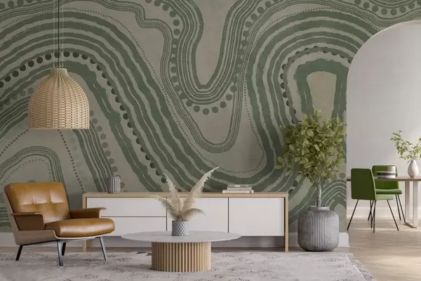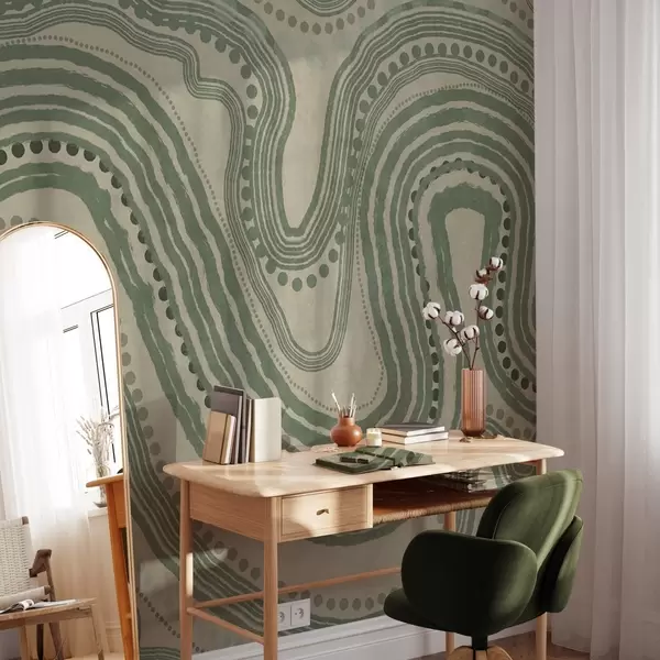 Тапете за зид Апстрактне зелене и беж таласасте линије и тачке, модерна текстурирана уметност бр. w09747