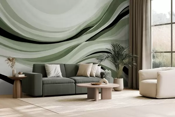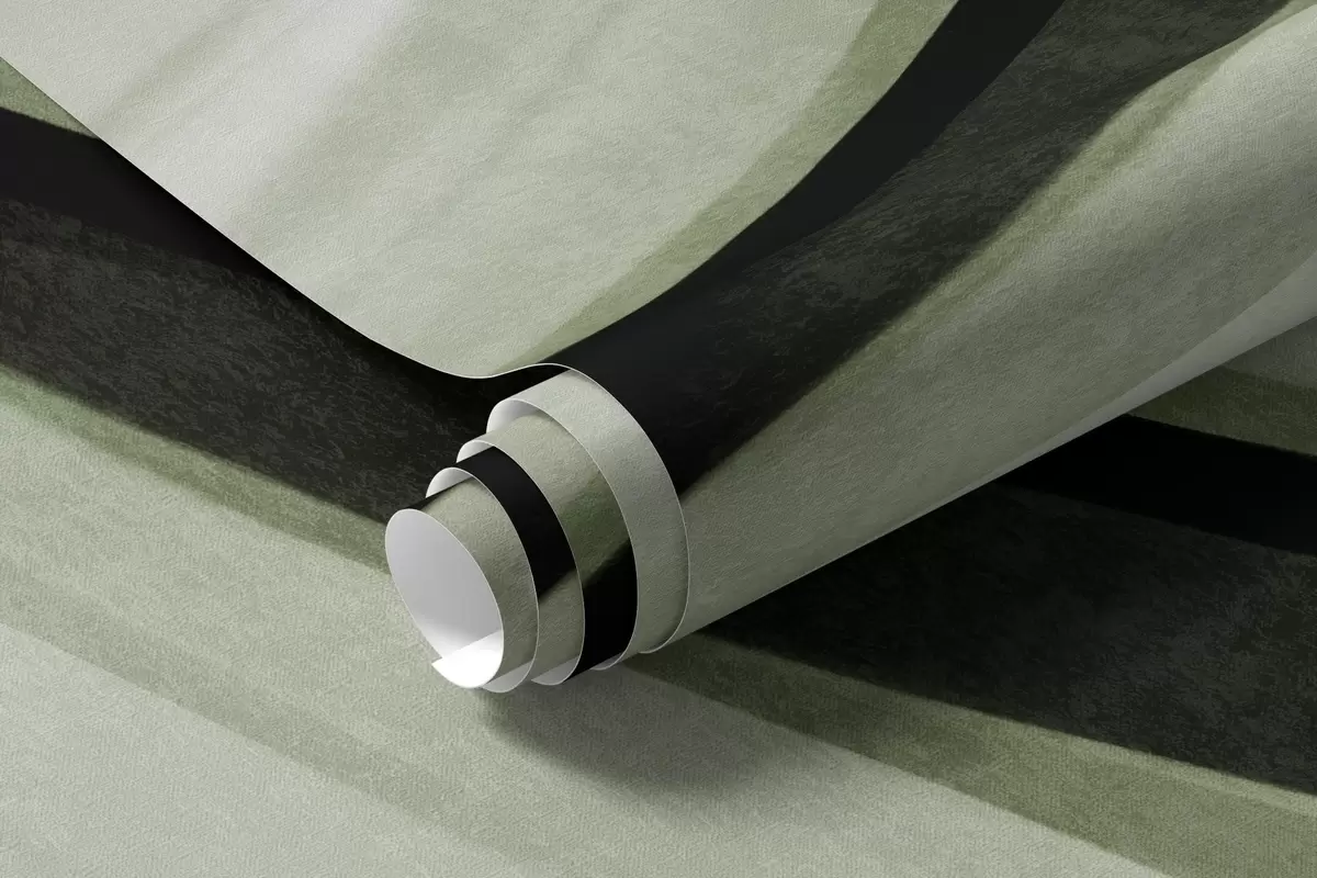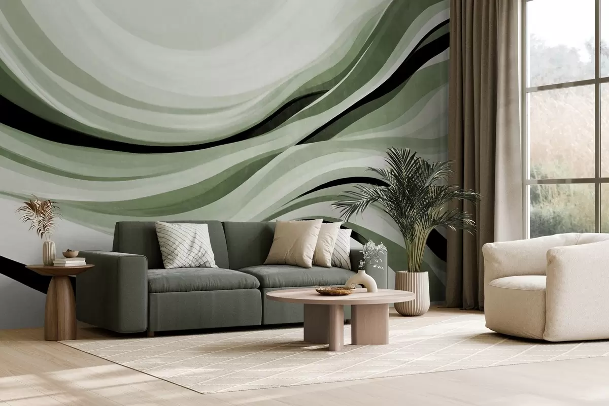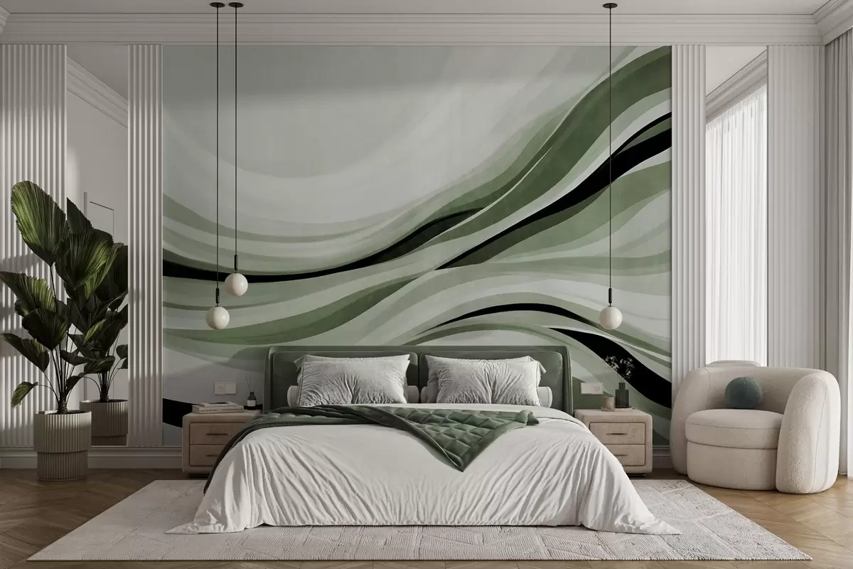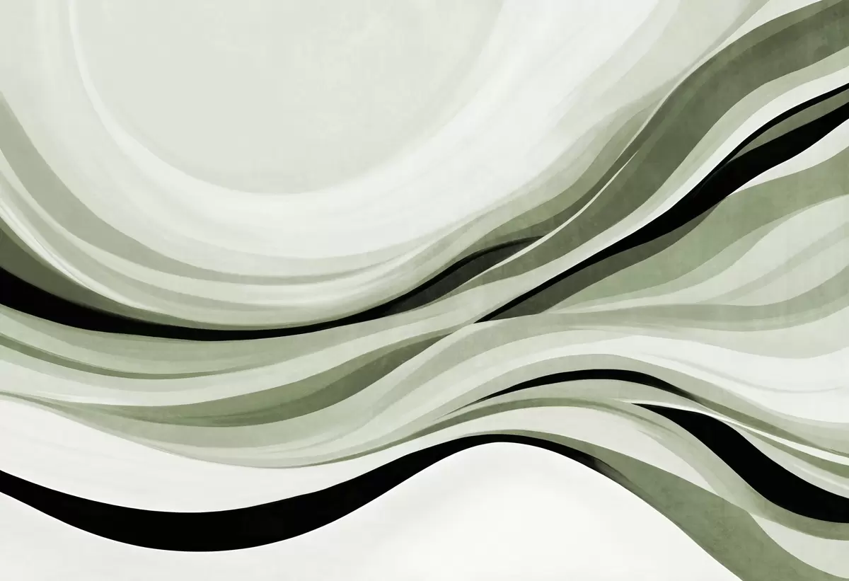 Тапете за зид Апстрактне таласасте линије у нијансама зелене и црне на светлој позадини, текстурирана уметност бр. w09748v1