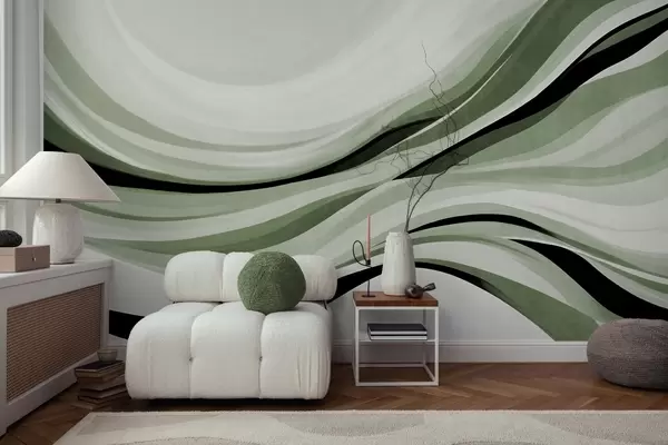 Тапете за зид Апстрактне таласасте линије у нијансама зелене и црне на светлој позадини, текстурирана уметност бр. w09748v1