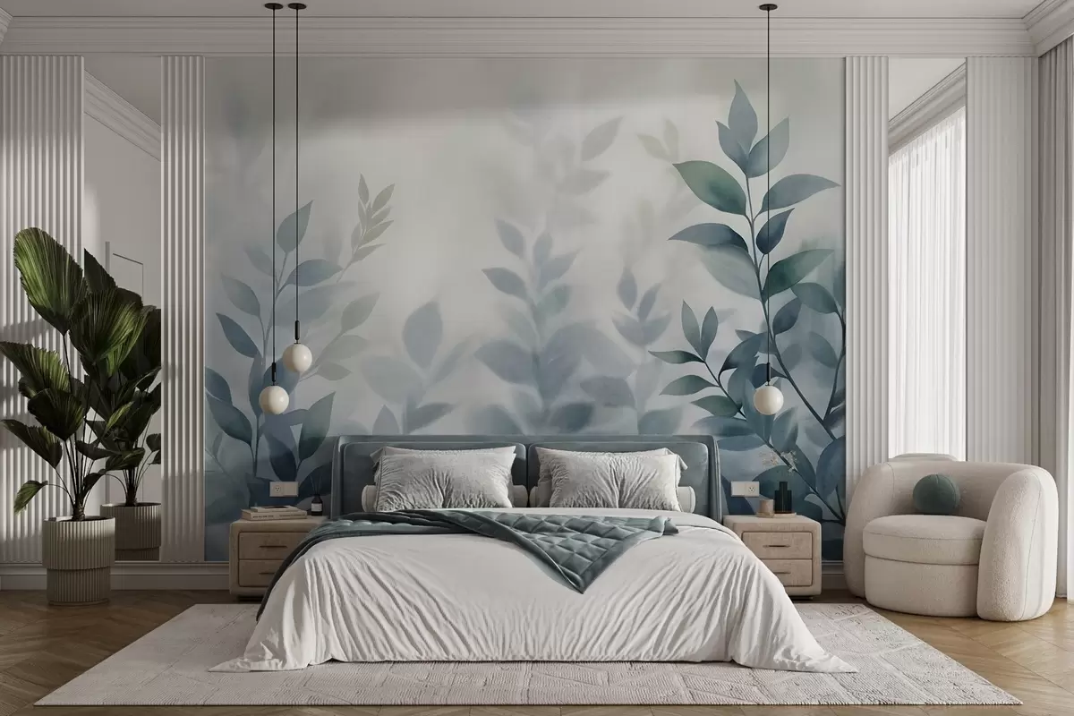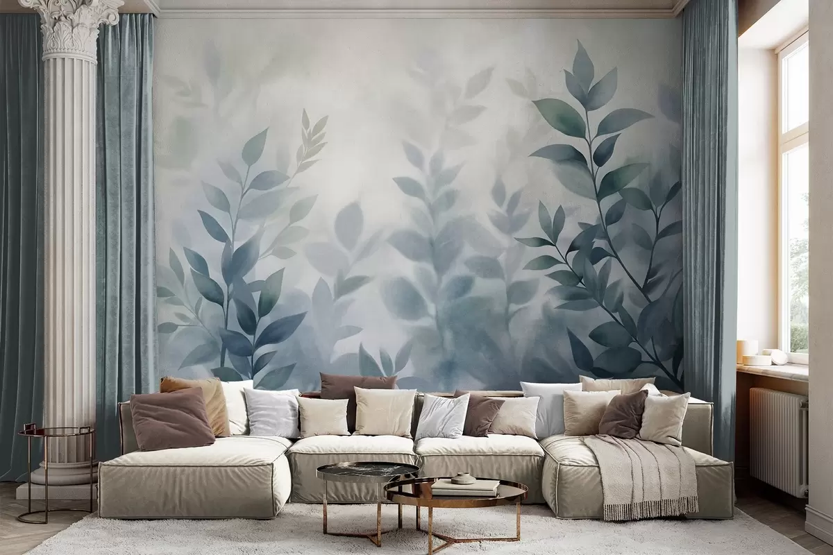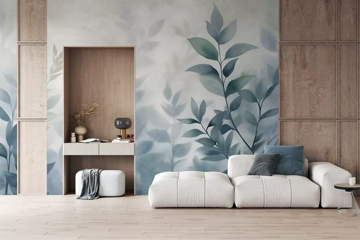 Тапете за зид Нежне гране са пригушеним плавим листовима, стил акварела, текстурирана уметност бр. w09750v1