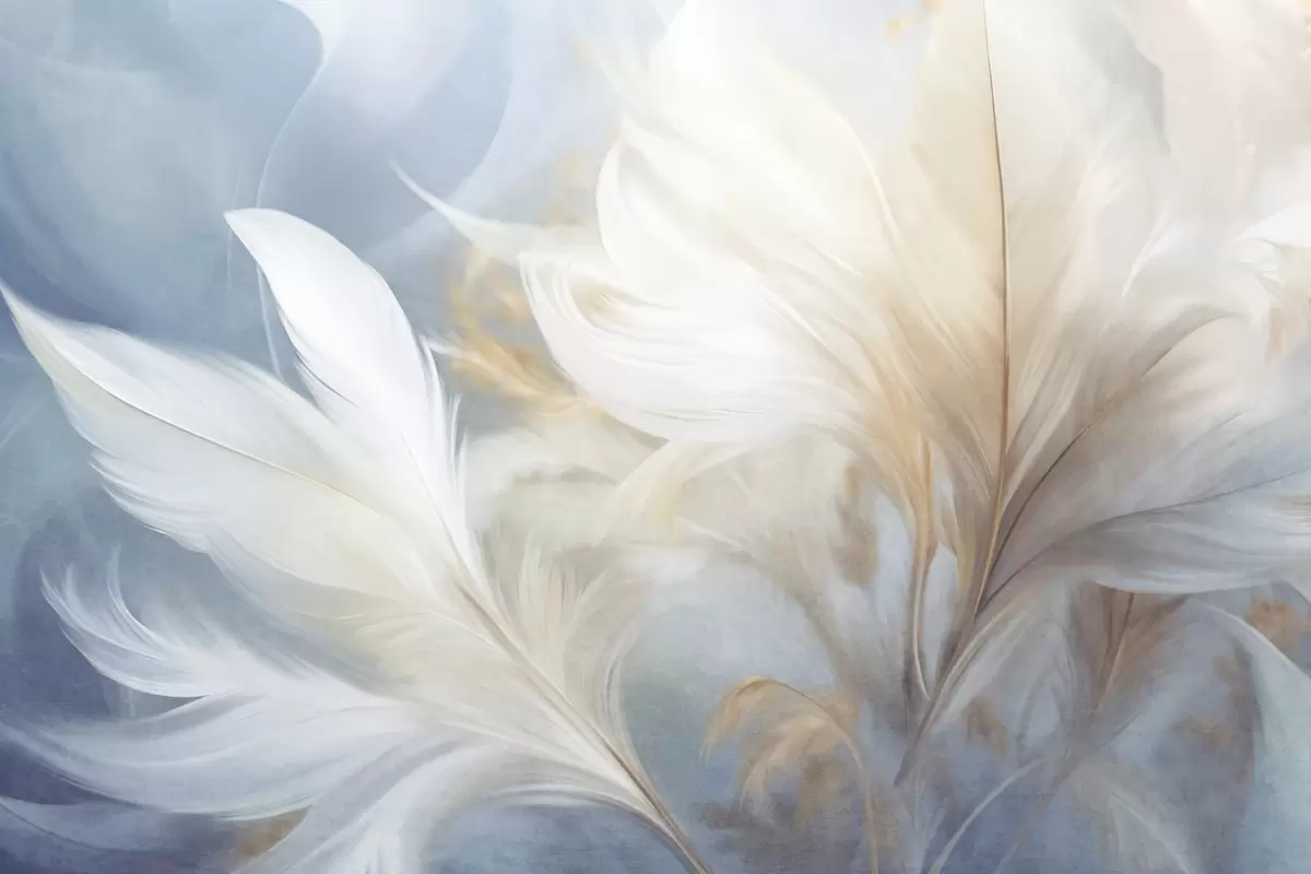 Тапете за зид Текстурирано меко, бело перје и замућена пампас трава са плаво-белом позадином бр. w09758