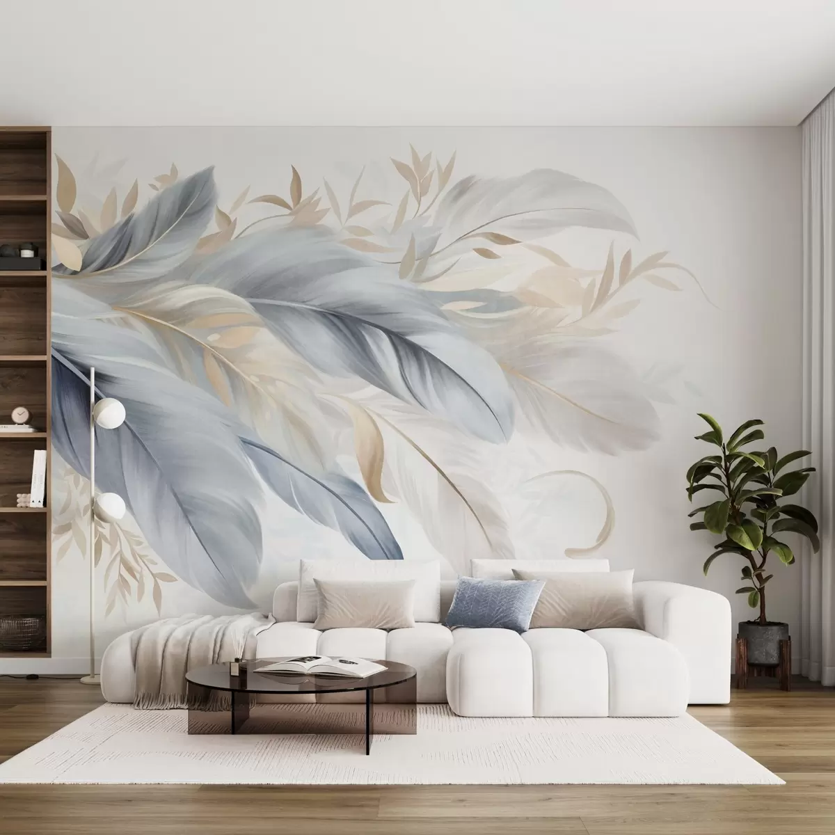 Тапете за зид Текстурирано перје пастелних боја и нежно лишће на светлој позадини бр. w09763