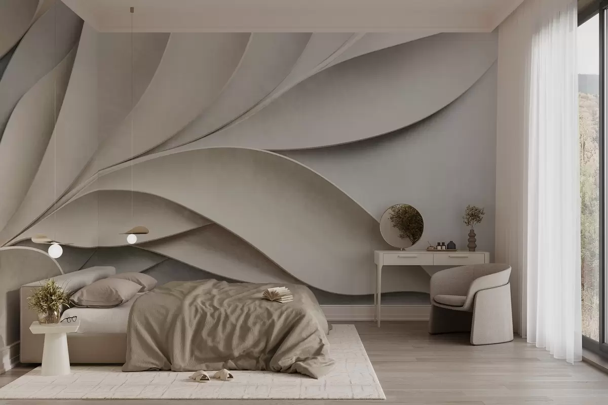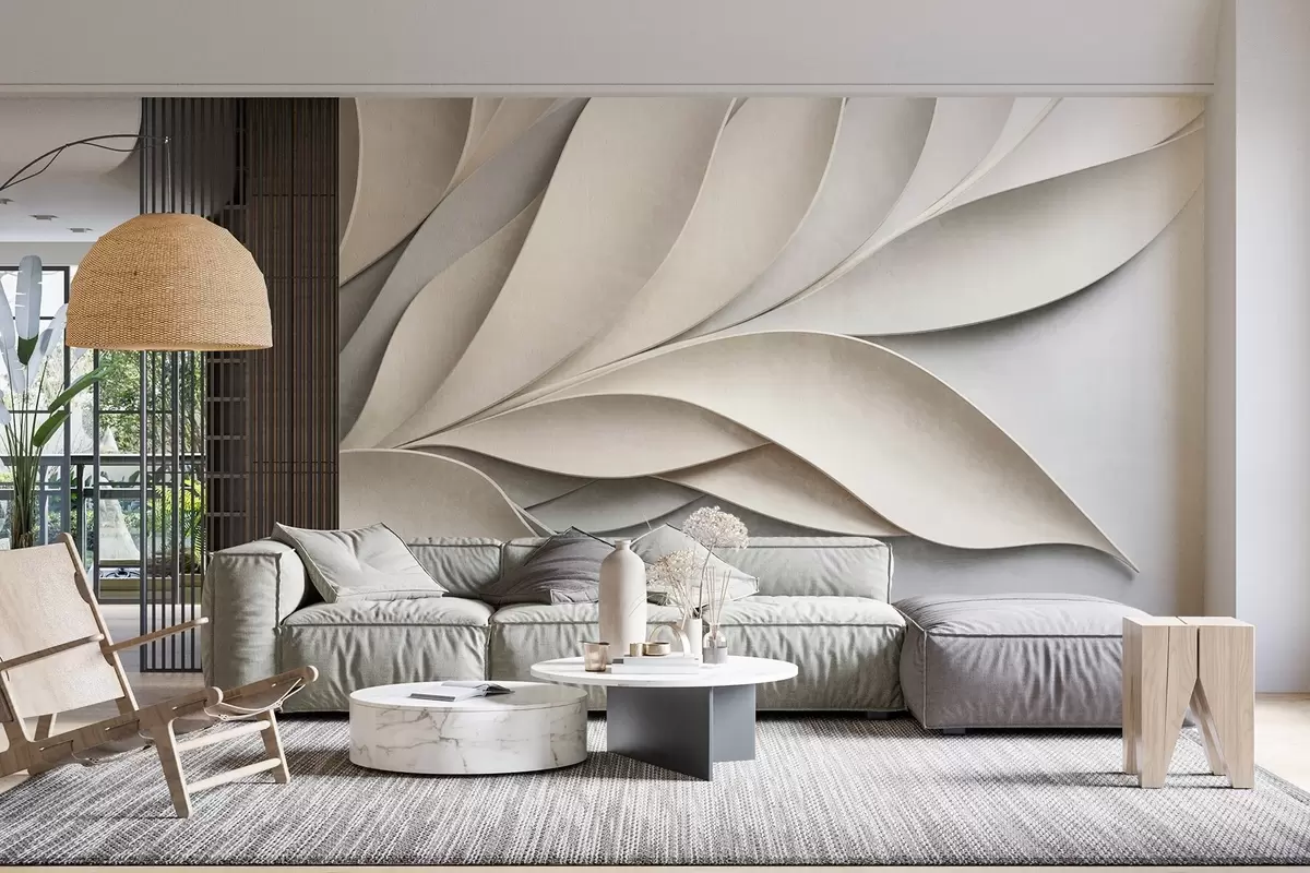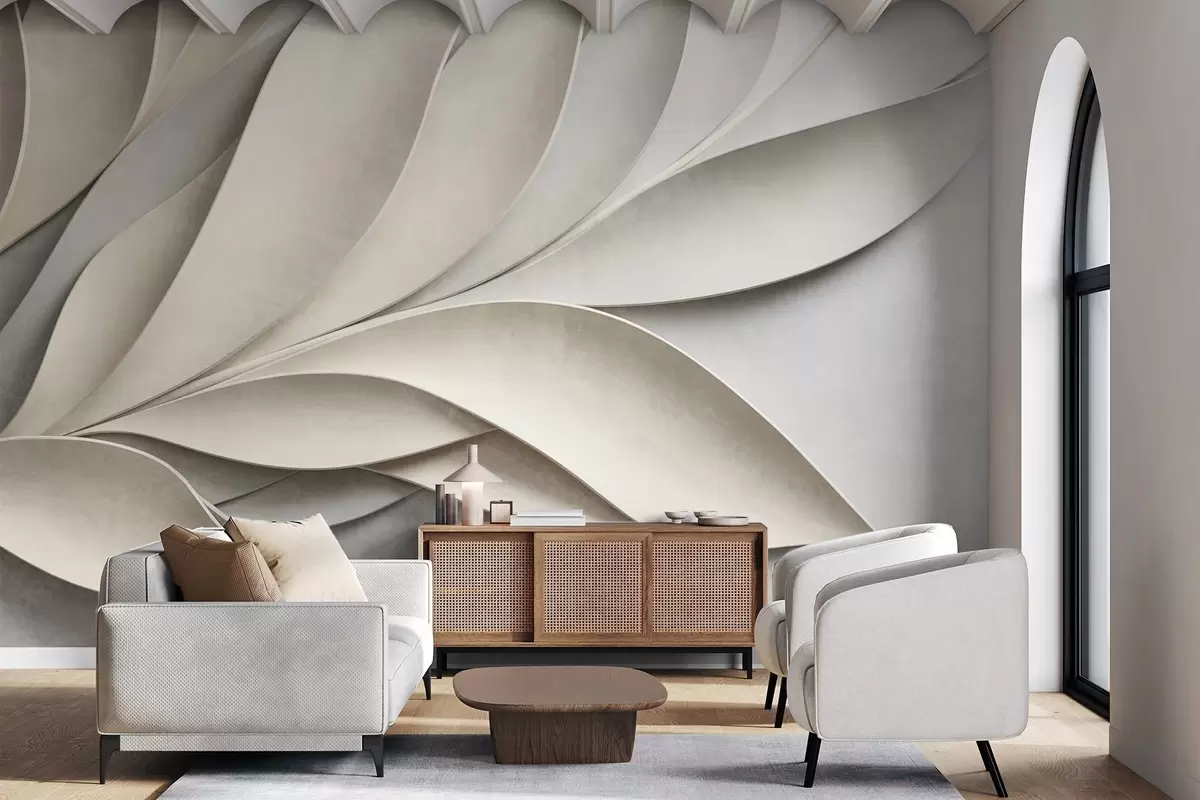 Тапете за зид Апстрактно лишће у беж и сивој боји, текстурирана модерна уметност бр. w09769