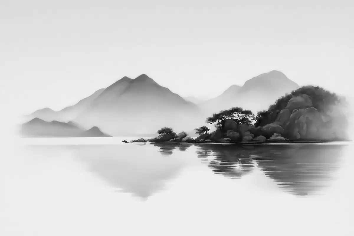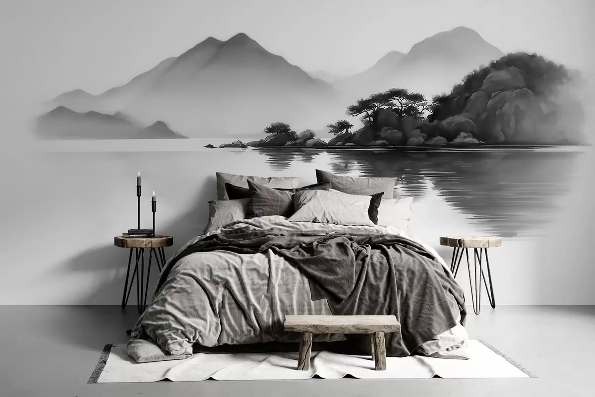 Тапете за зид Црно-бели пејзаж са планинама и језером у мекој магли бр. w09803