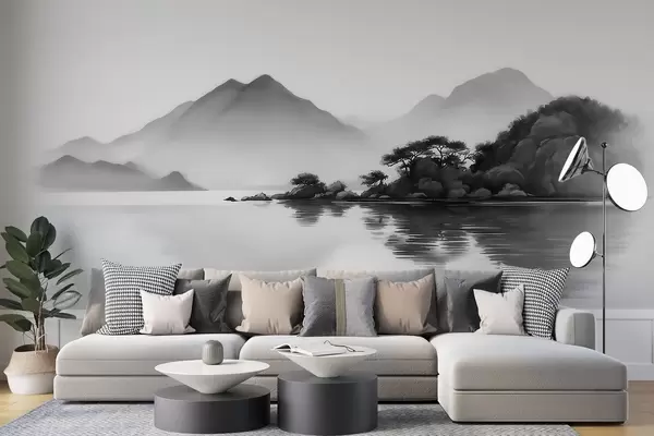 Тапете за зид Црно-бели пејзаж са планинама и језером у мекој магли бр. w09803