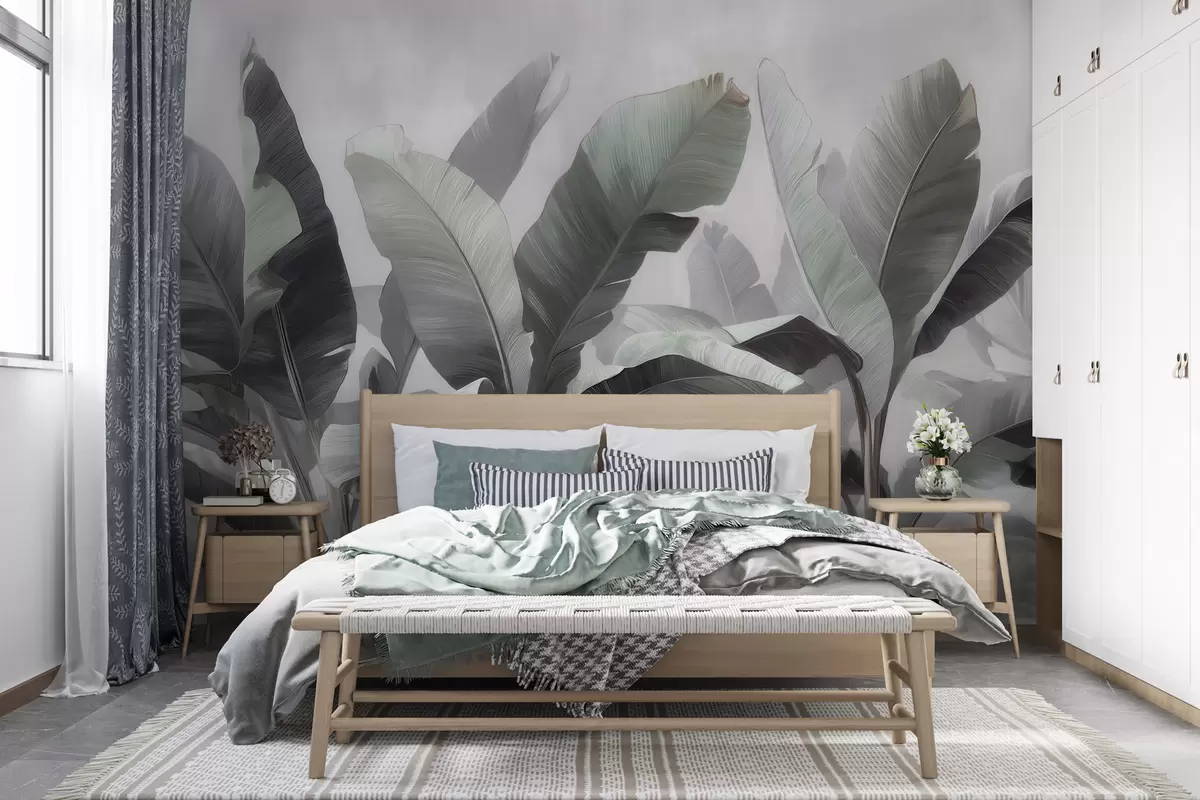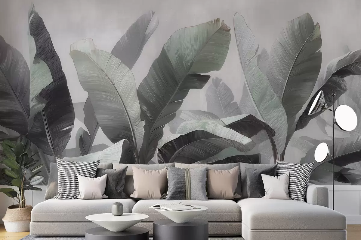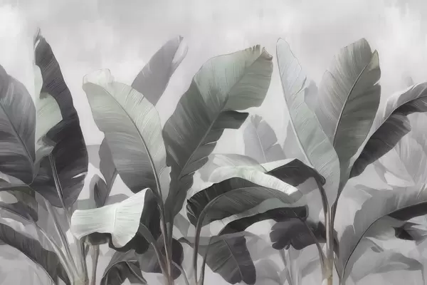 Тапете за зид Апстрактни тропски велики листови банане у неутралној палети са меким сиво-зеленим тоновима бр. w09805