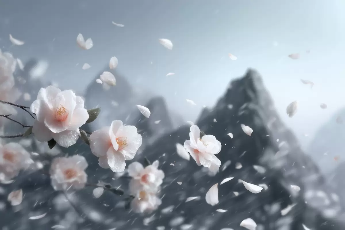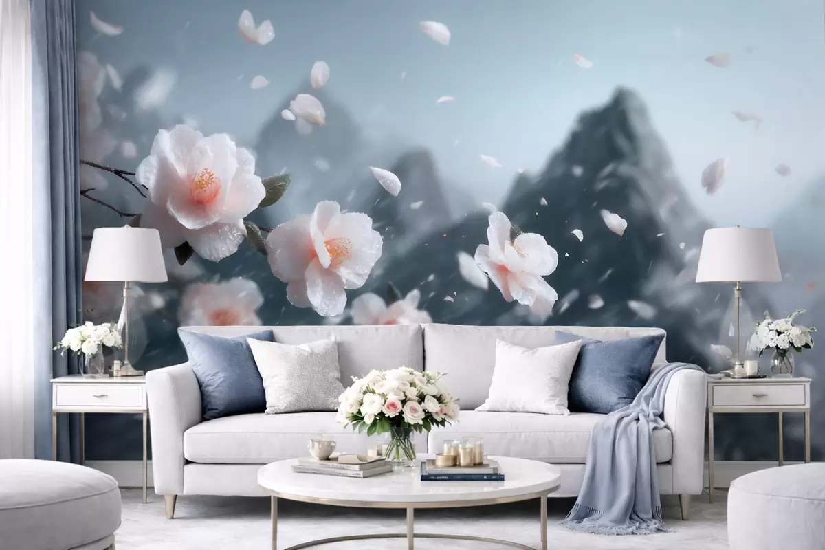 Тапете за зид Нежни цветови трешње на планинском пољу, атмосферски јапански пејзаж у пастелним тоновима бр. w09808