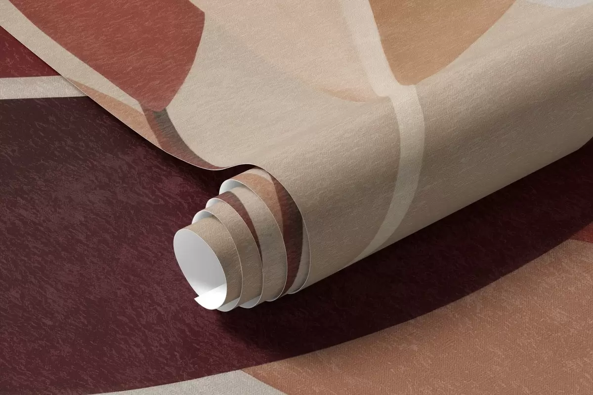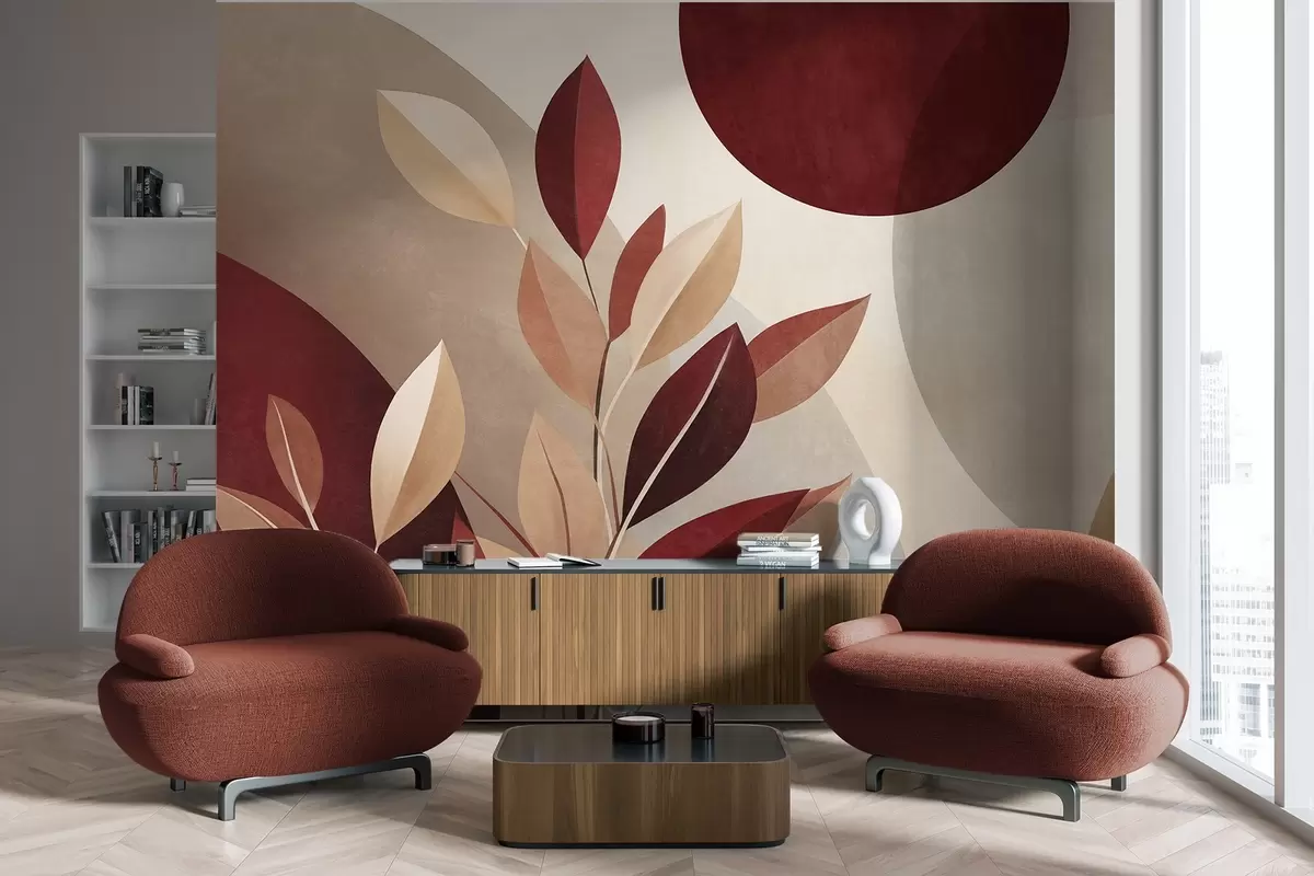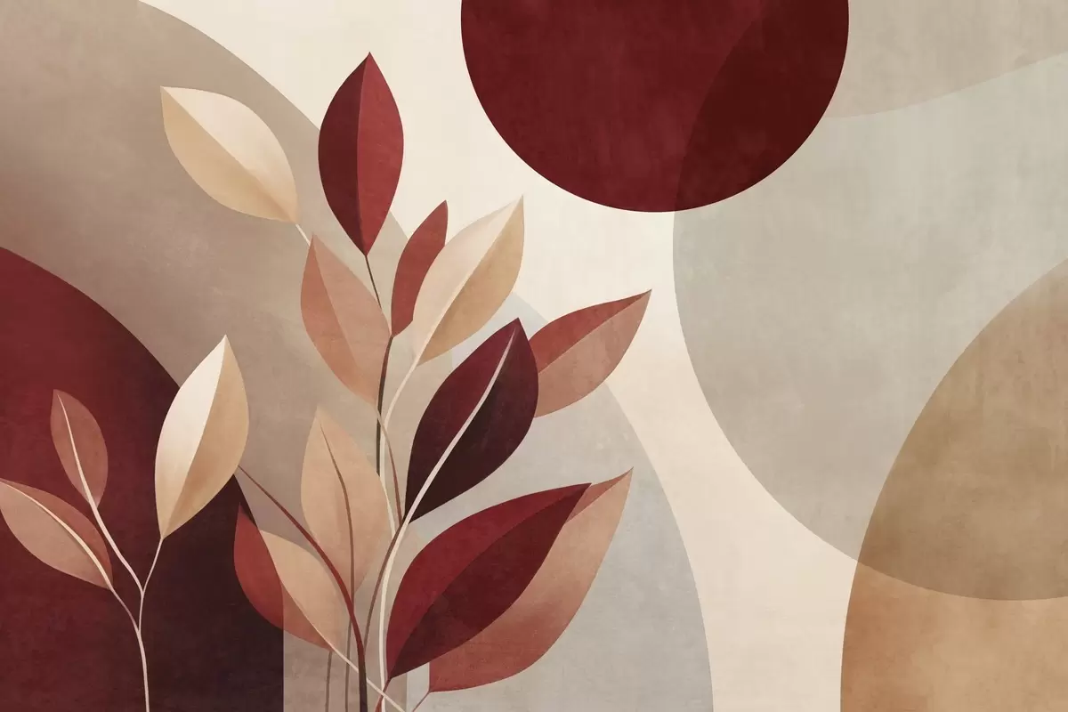 Тапете за зид Текстурирано бордо и беж лишће на позадини апстрактних облика, минимализам, модерна уметност бр. w09829