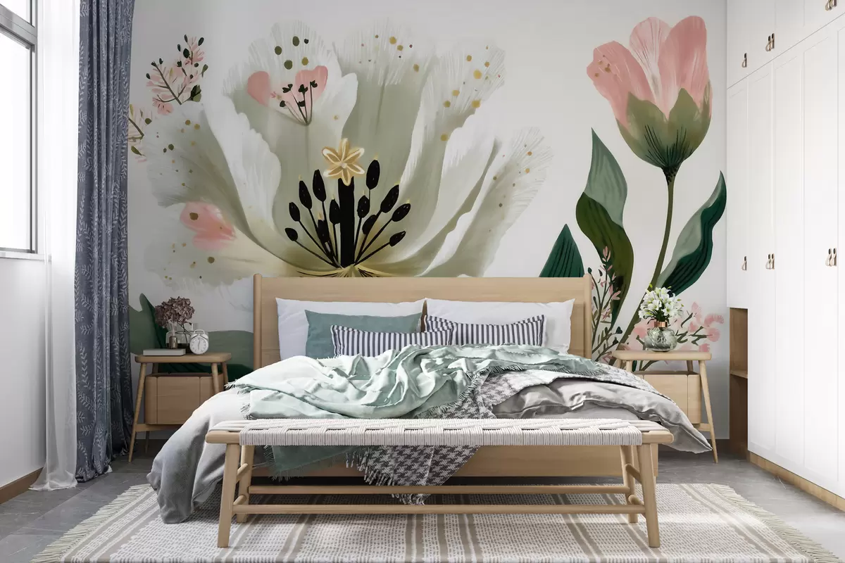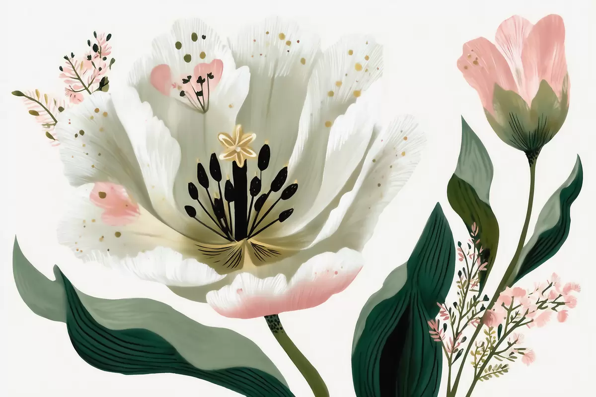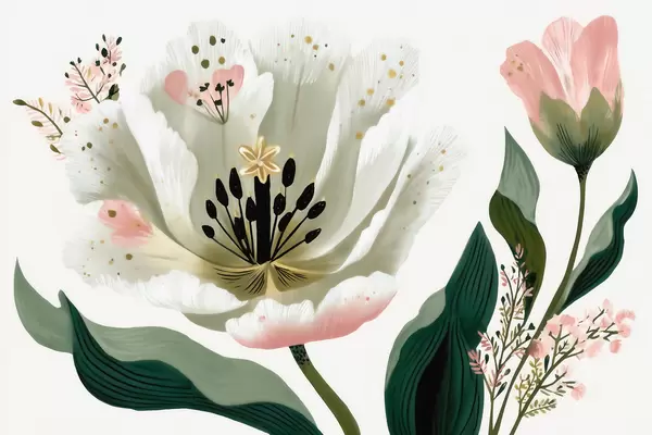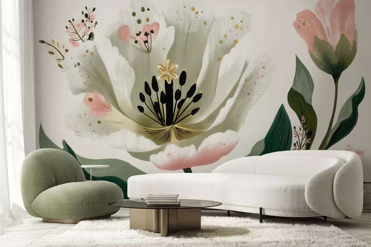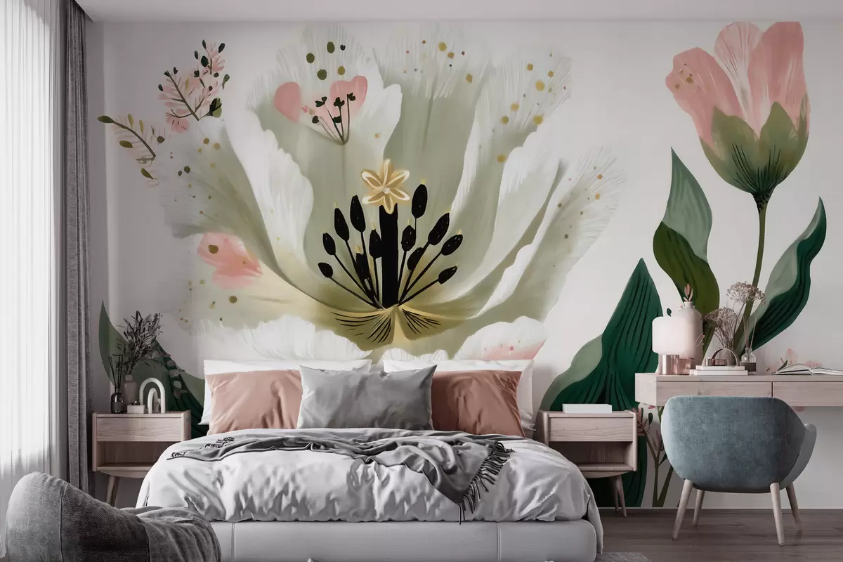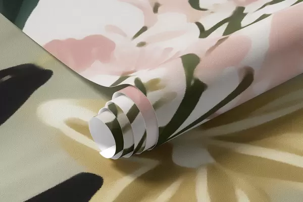 Тапете за зид Цвет са зеленим листовима и нежно ружичастим акцентима у акварел стилу бр. w09836