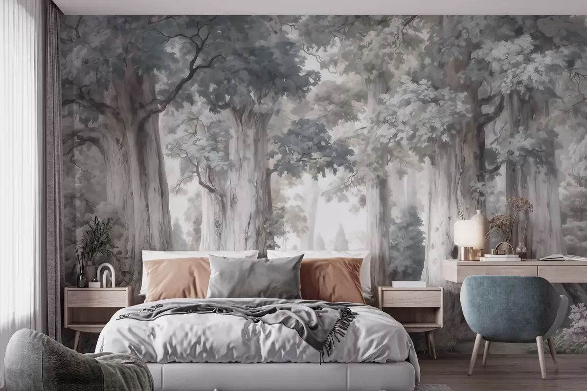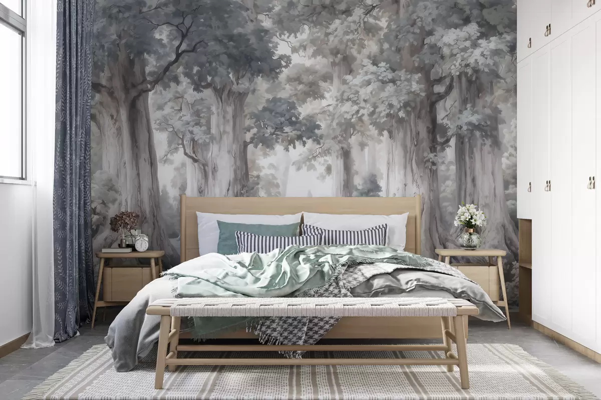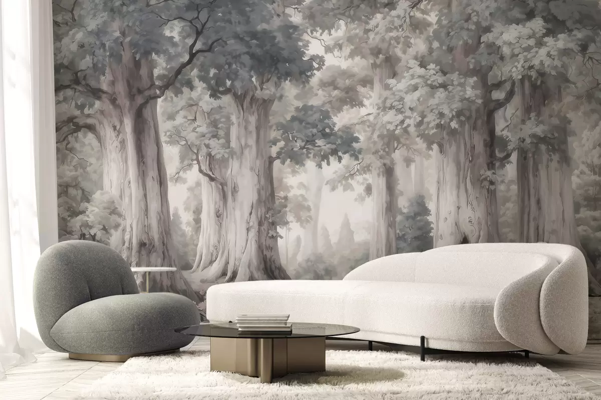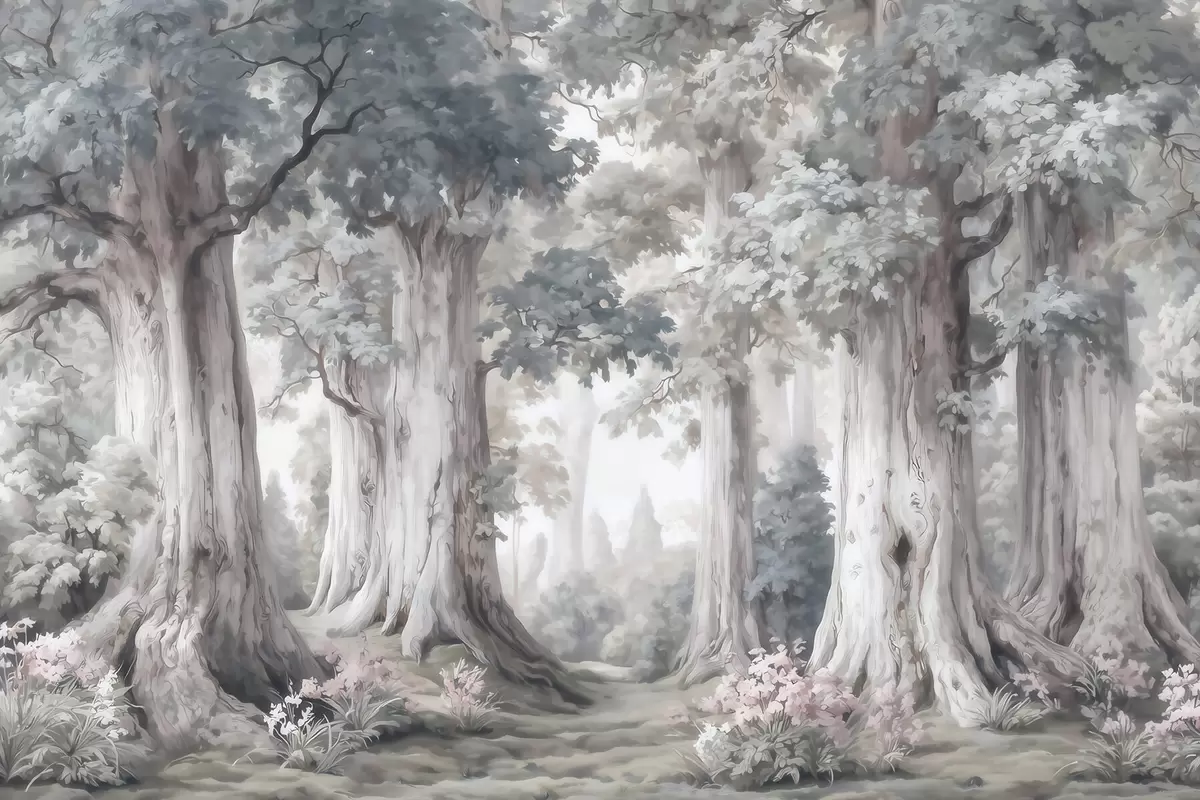 Тапете за зид Бајковита шума са високим дрвећем и нежном пригушеном палетом у стилу акварела бр. w09849