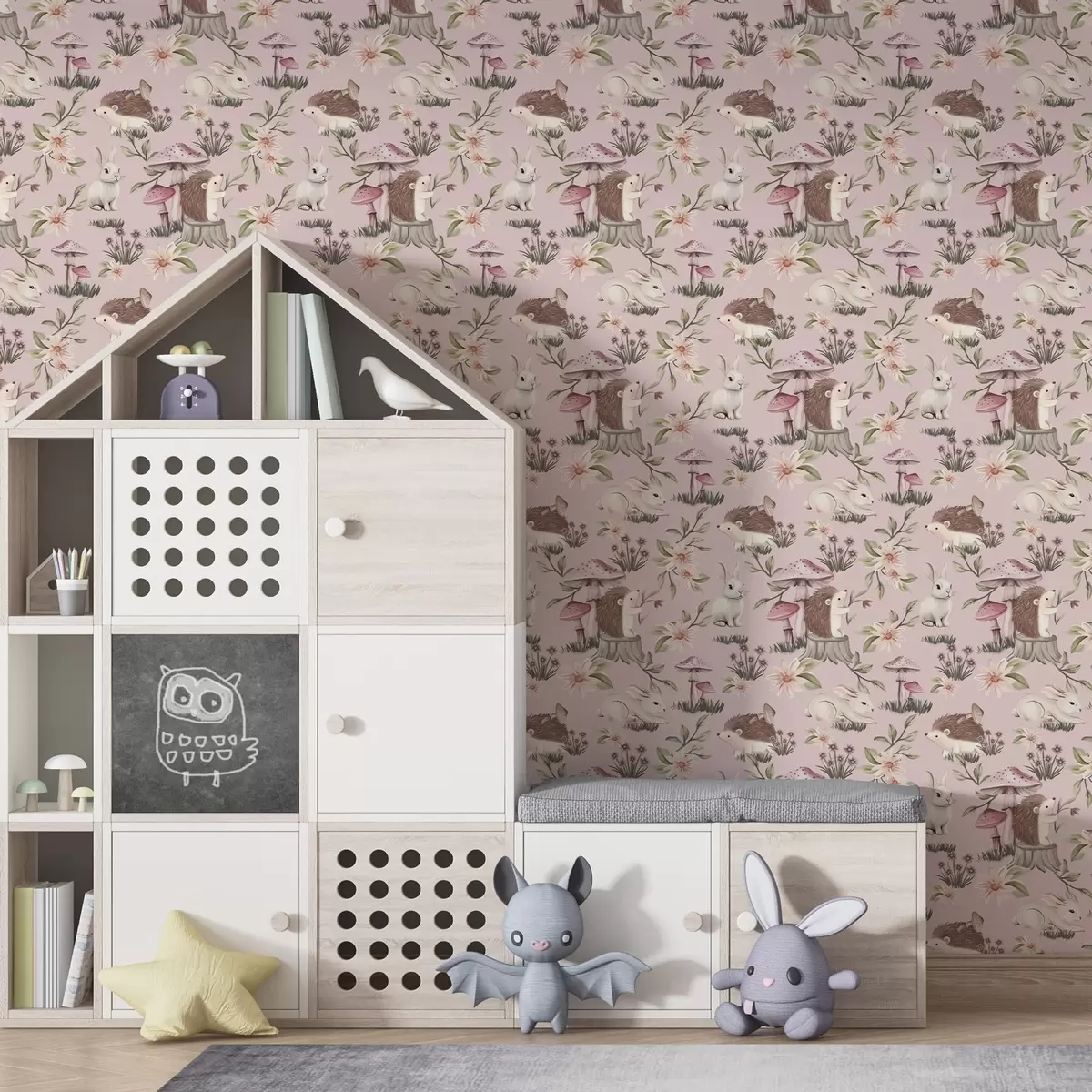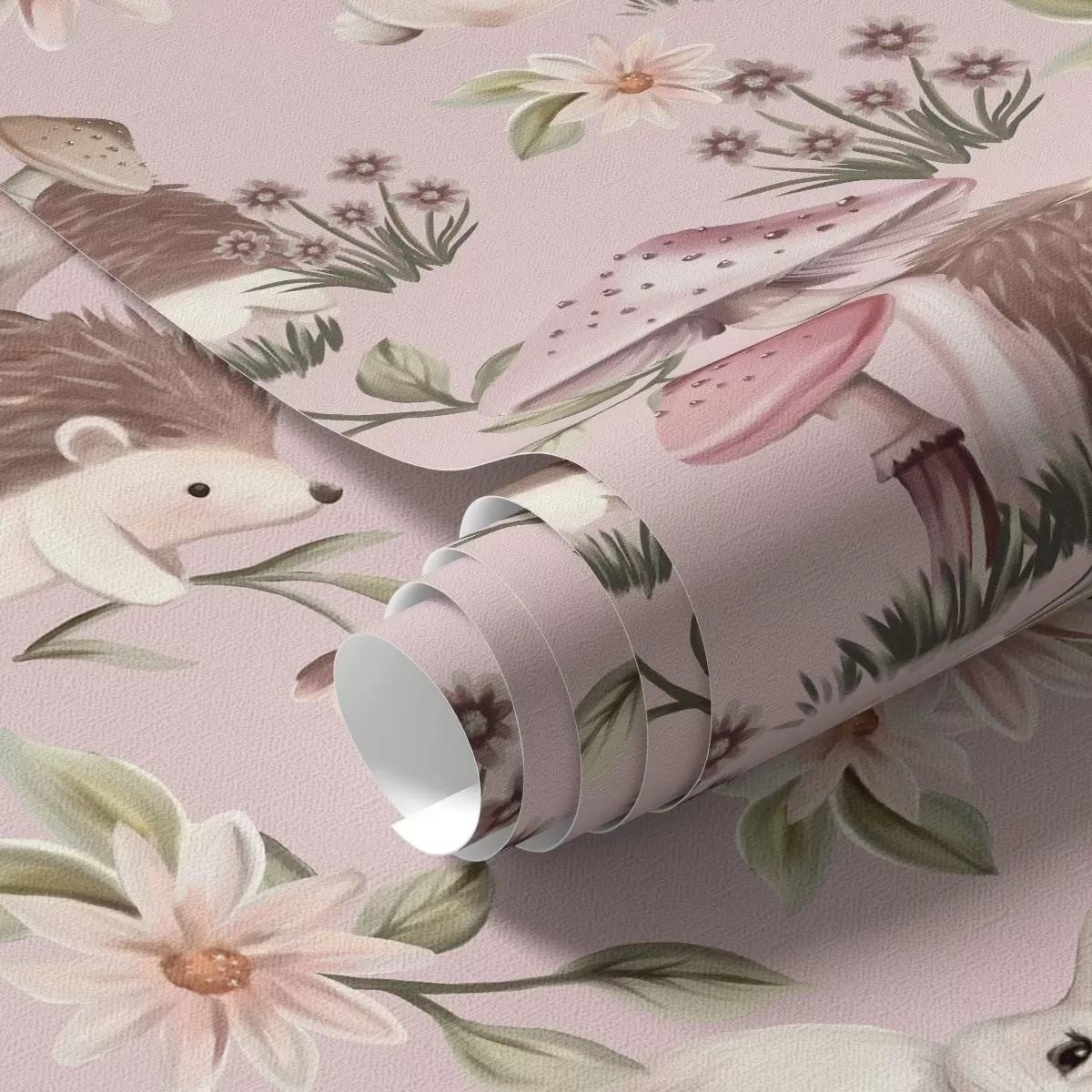 Tapeta Бајковити јежеви, зечеви и цвеће међу печуркама на ружичастој позадини бр. a00111