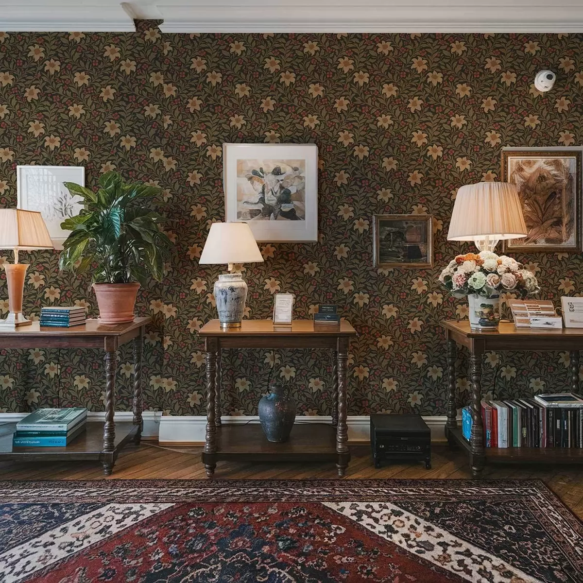 Tapeta Тамна позадина са жутим и црвеним цвећем у стилу арт нувоа бр. a00293