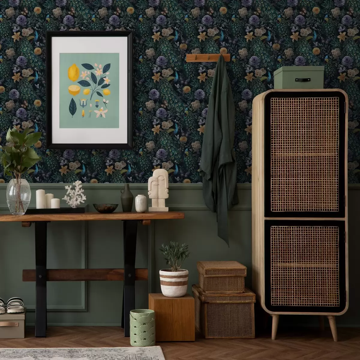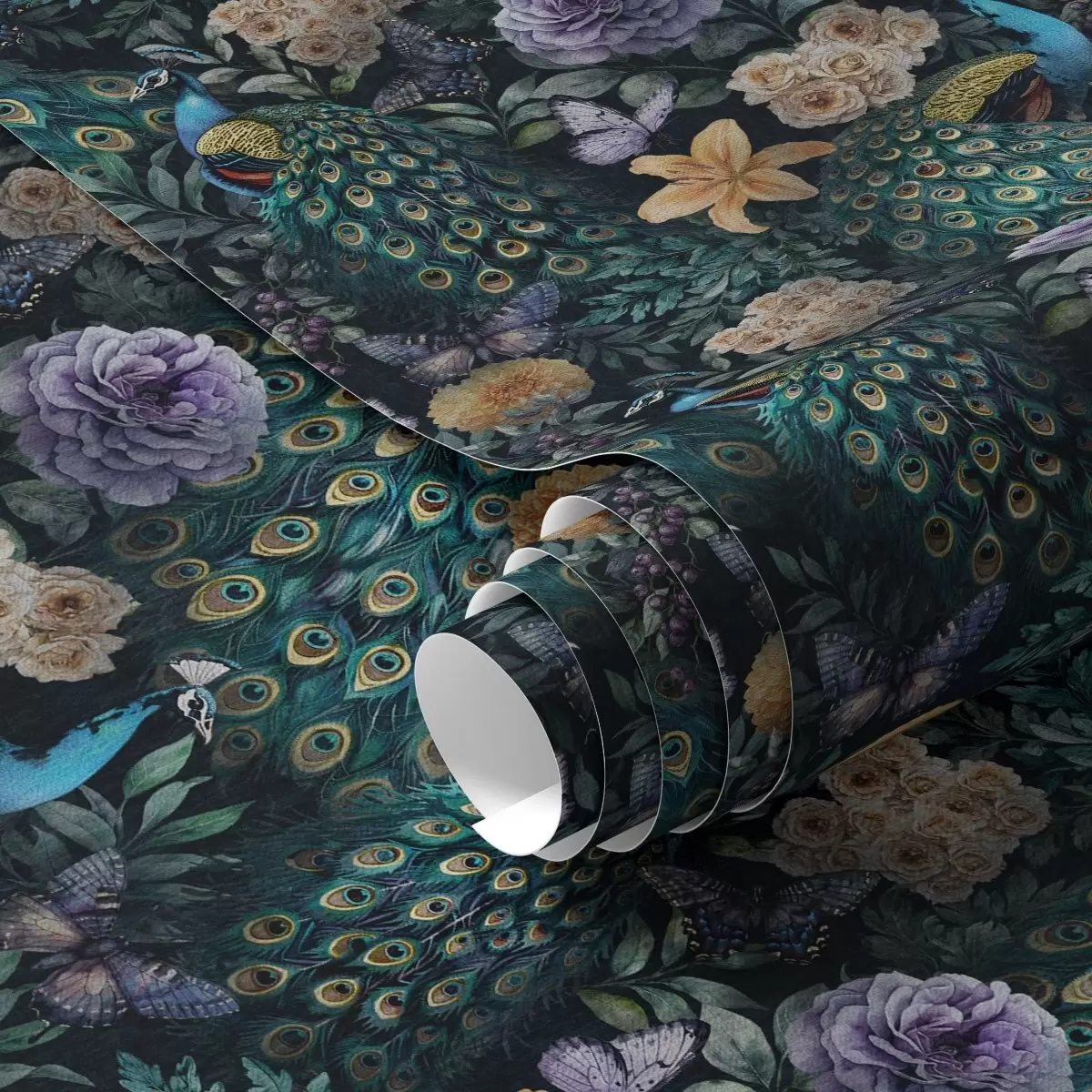 Tapeta Паунови међу тамним цвећем и лептирима бр. a00348