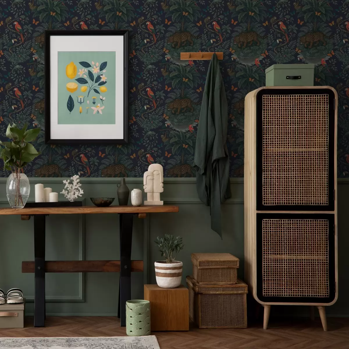 Tapeta Тропска џунгла са леопардом, леопардом, папагајима и лептирима бр. a00388