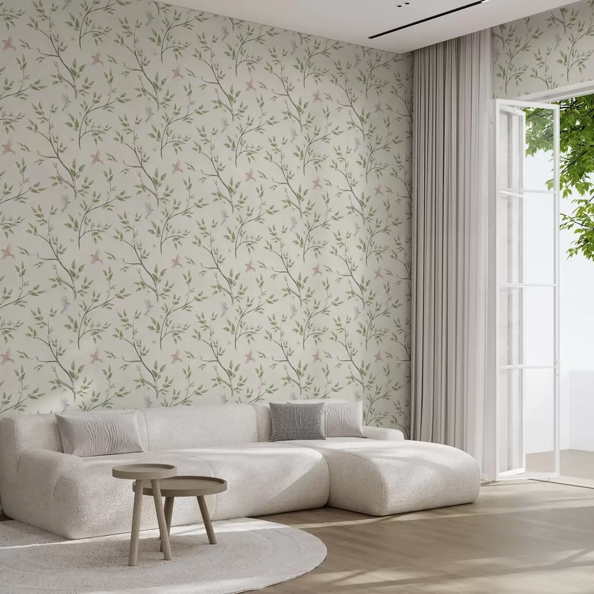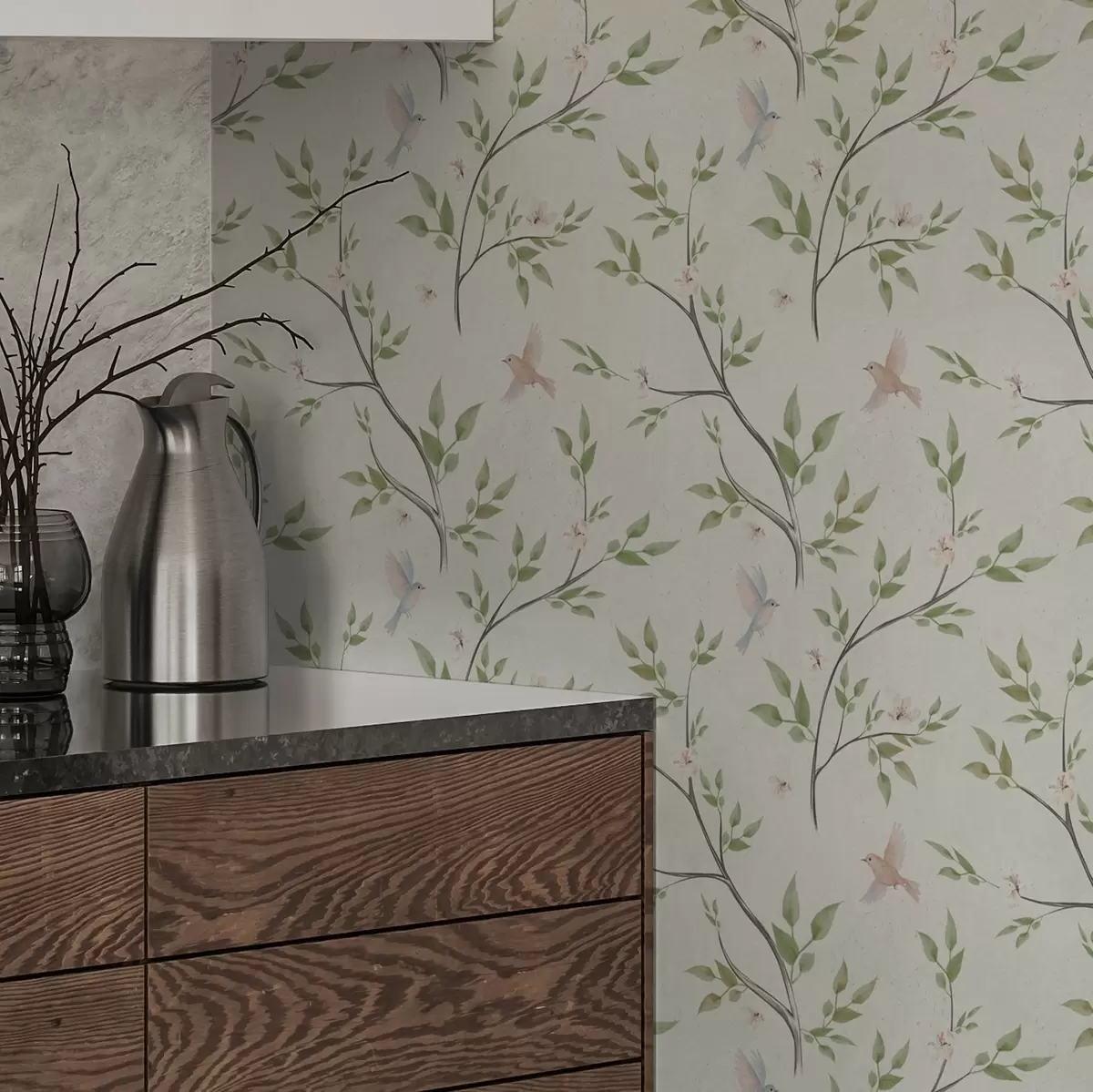 Tapeta Акварелне гране са лишћем и птицама на светлом тлу бр. a00496