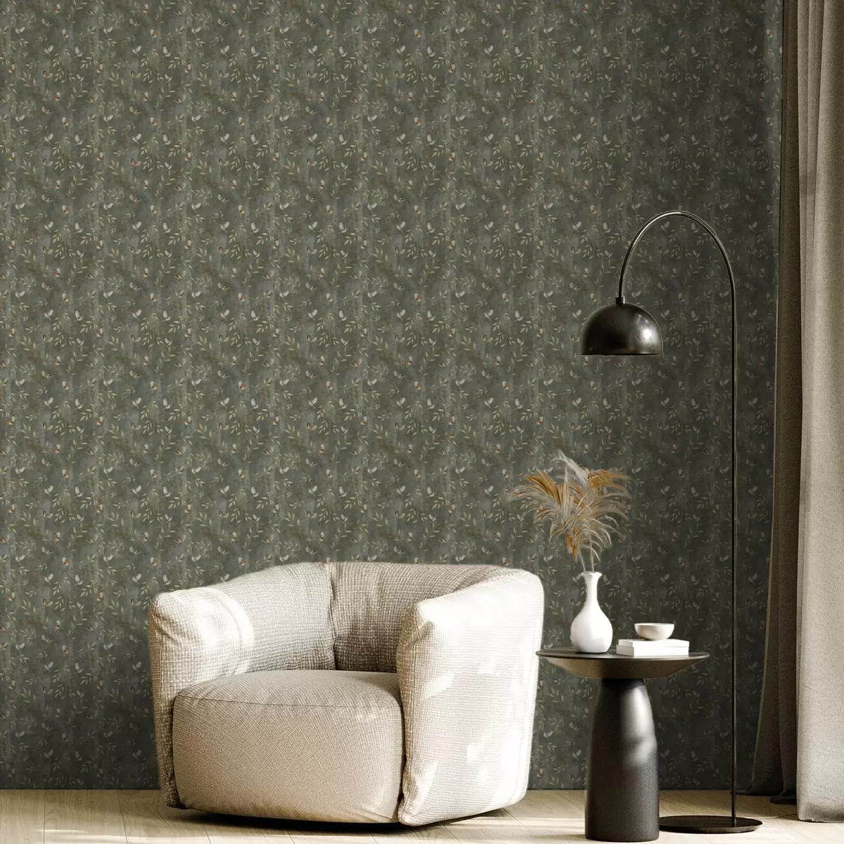 Tapeta Птице у наранџастом лишћу на дубоко зеленој позадини бр. a00591