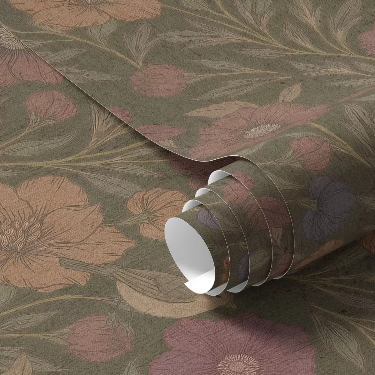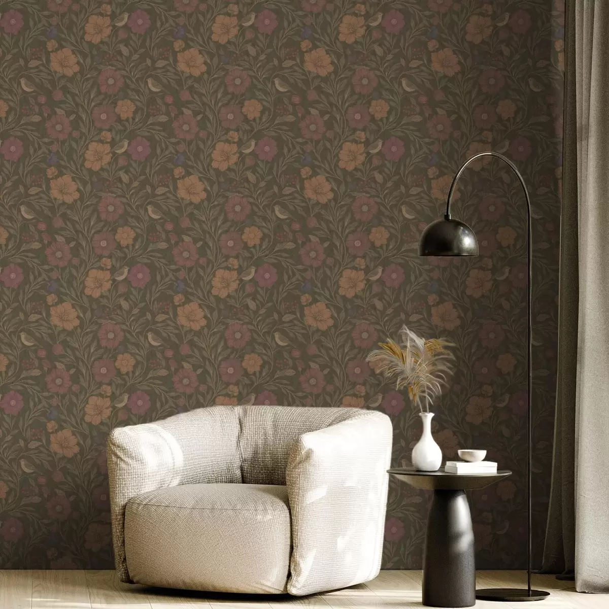 Tapeta Јесење цвеће и птице на маслинасто-смеђој позадини бр. a00605