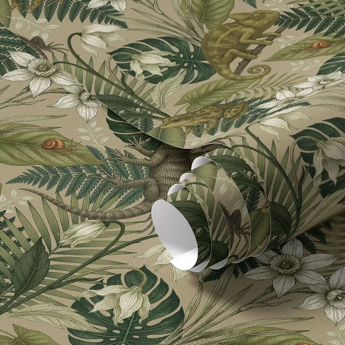 Tapeta Камелеони и тропско лишће, бело цвеће, беж тло бр. a00608