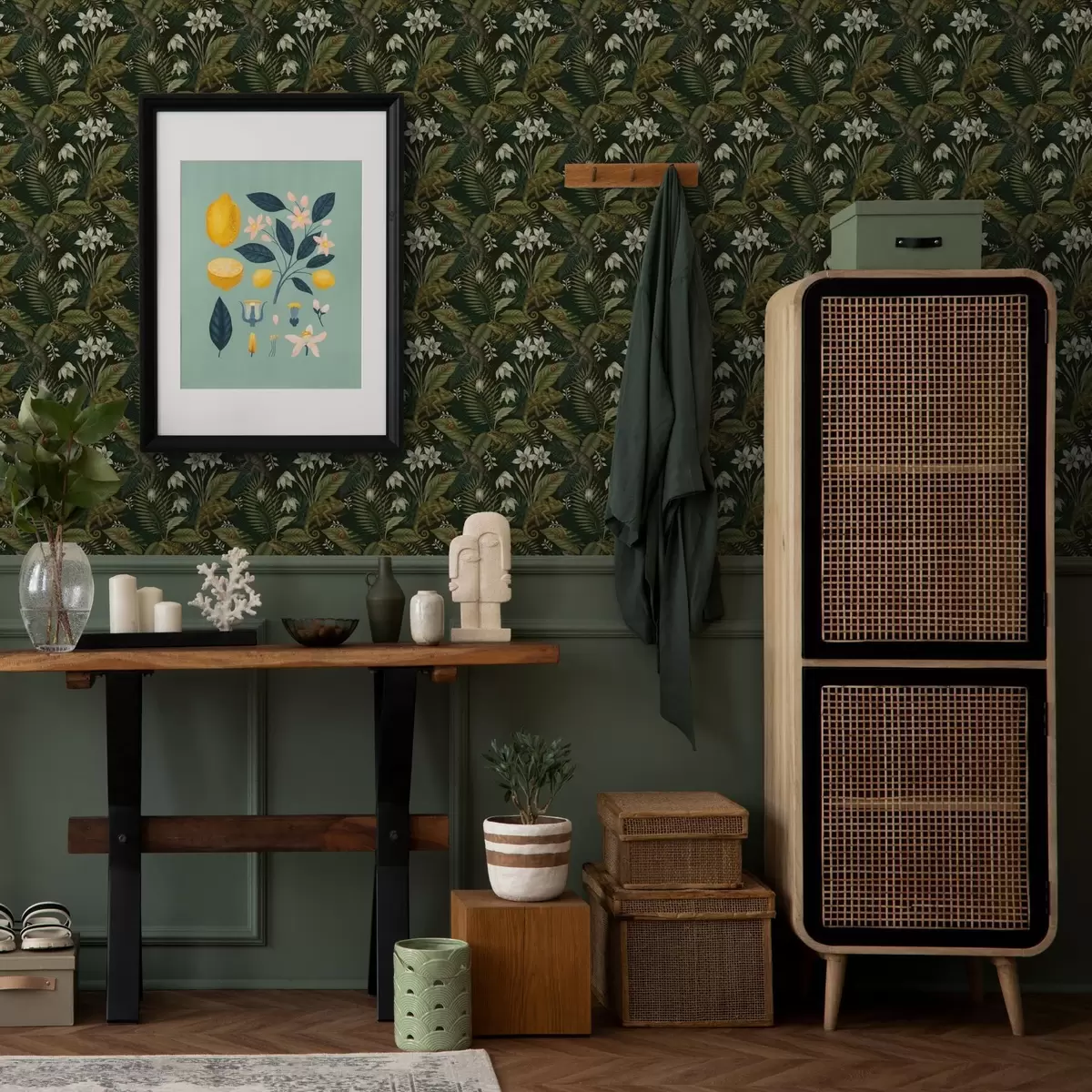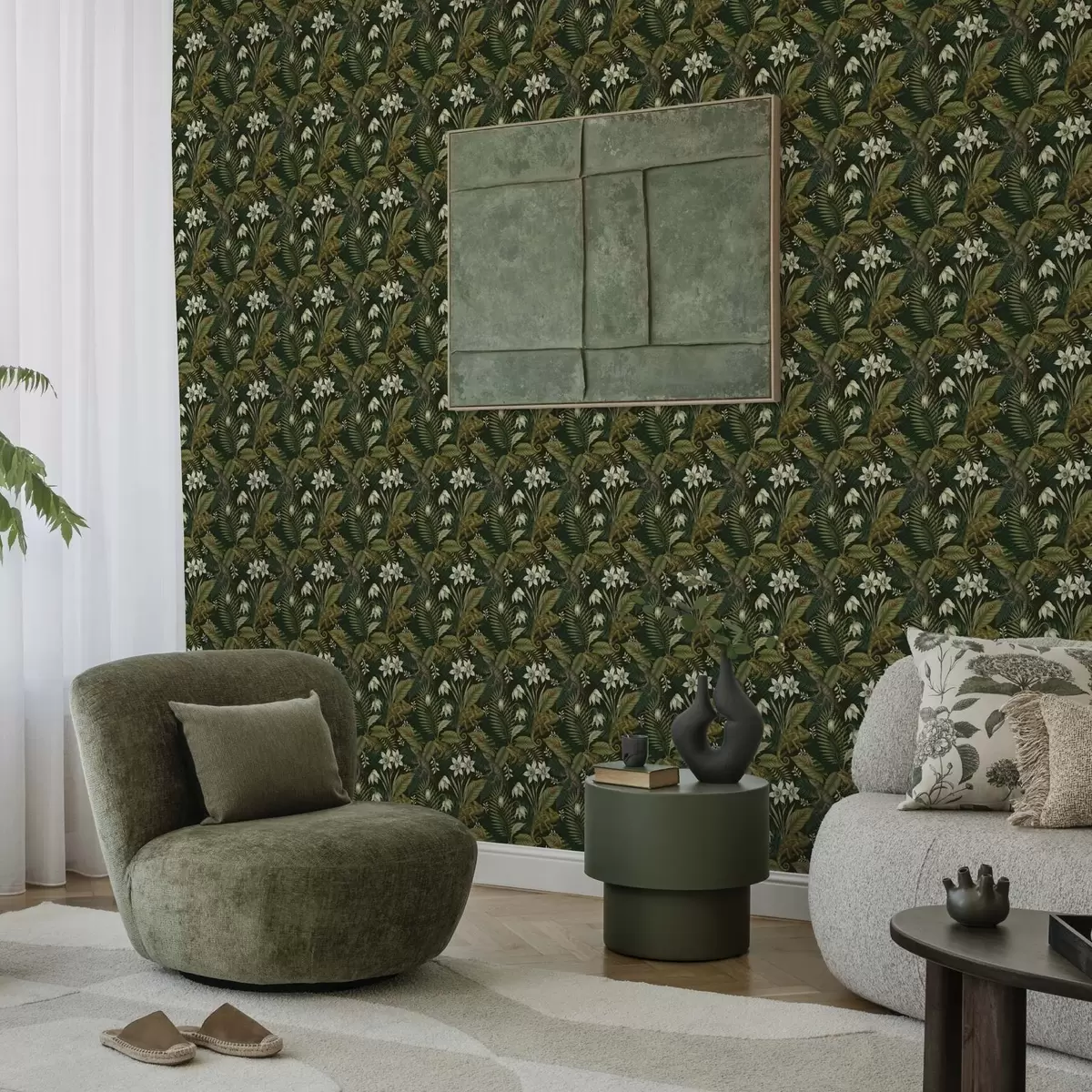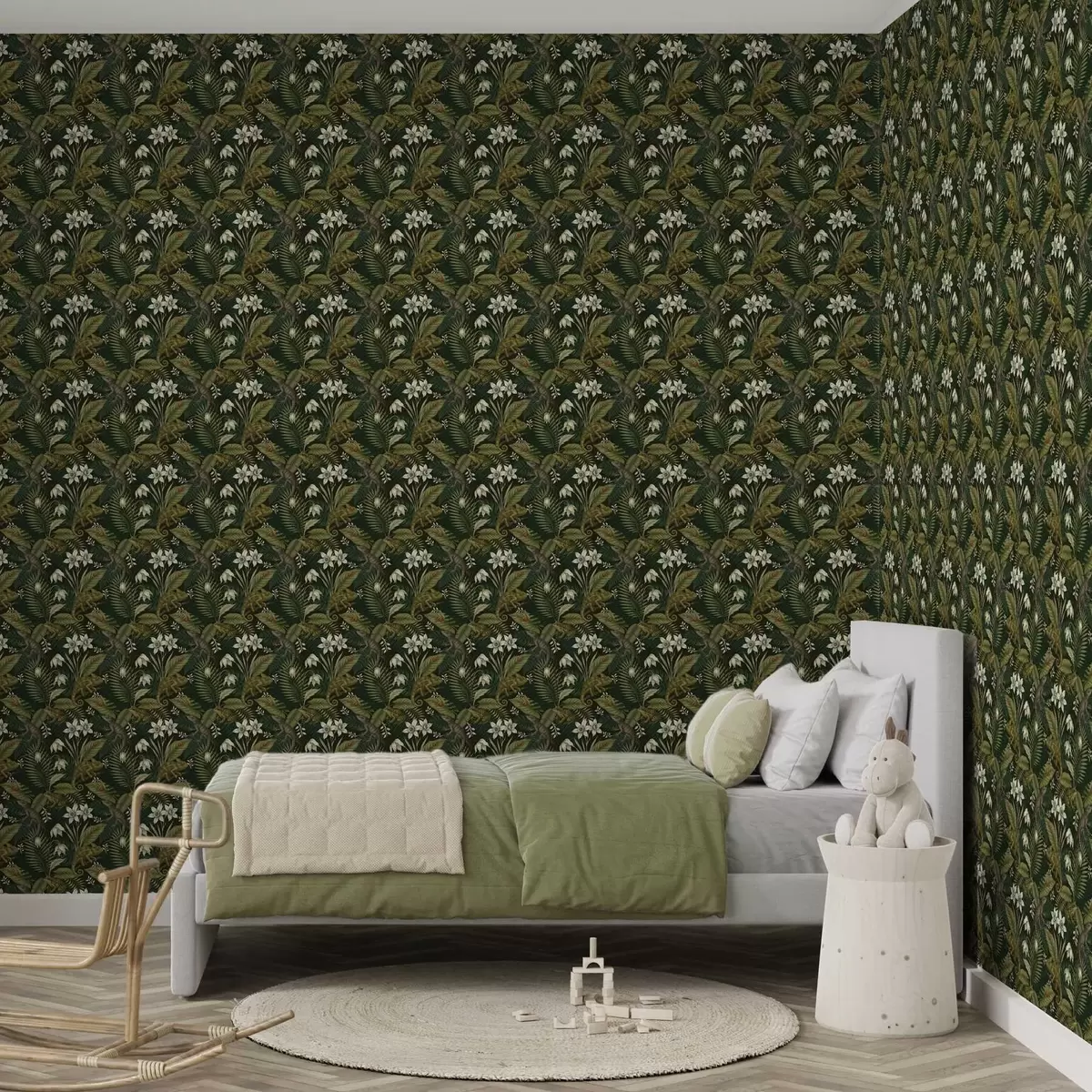 Tapeta Камелеони и тропско лишће, бело цвеће, тамно тло бр. a00608v1