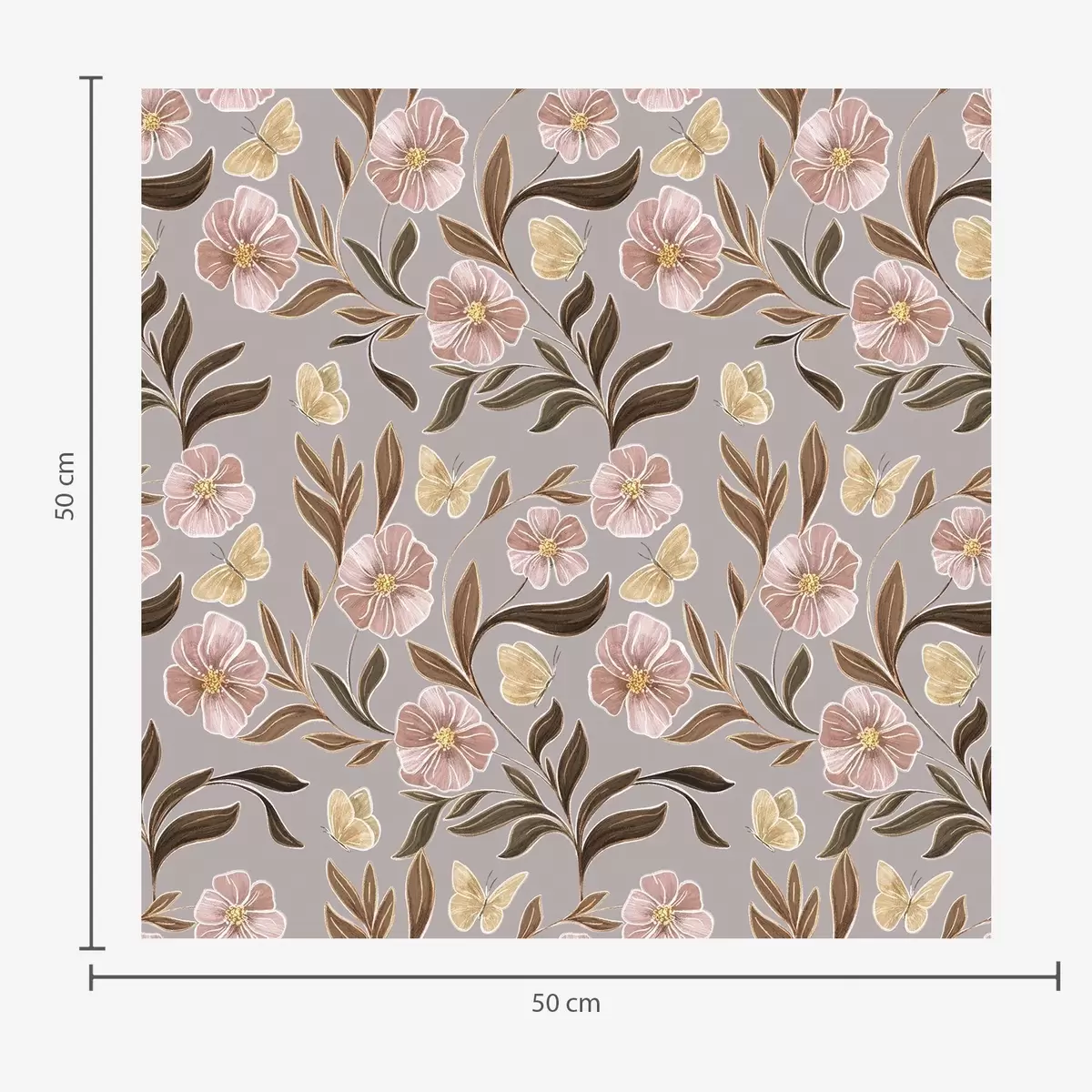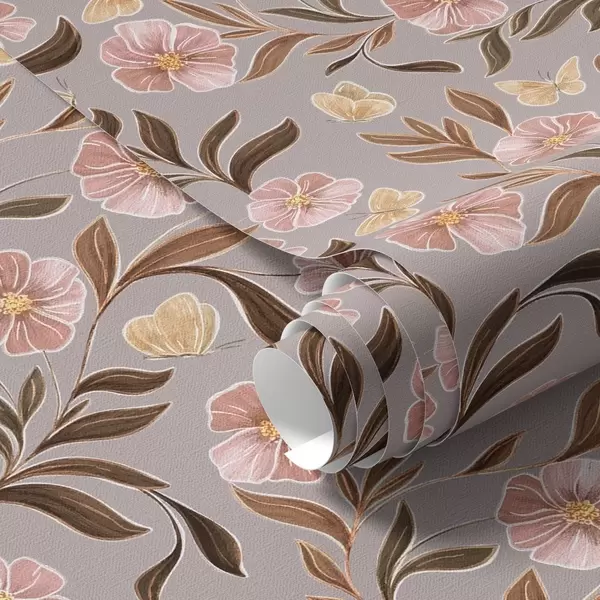 Tapeta Ружичасти цветови и лептири на сиво-беж позадини бр. a00633