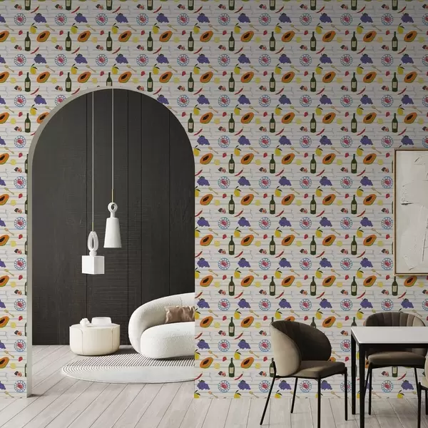 Tapeta Кухињски отисак са воћем, чашама и тањирима бр. a00638