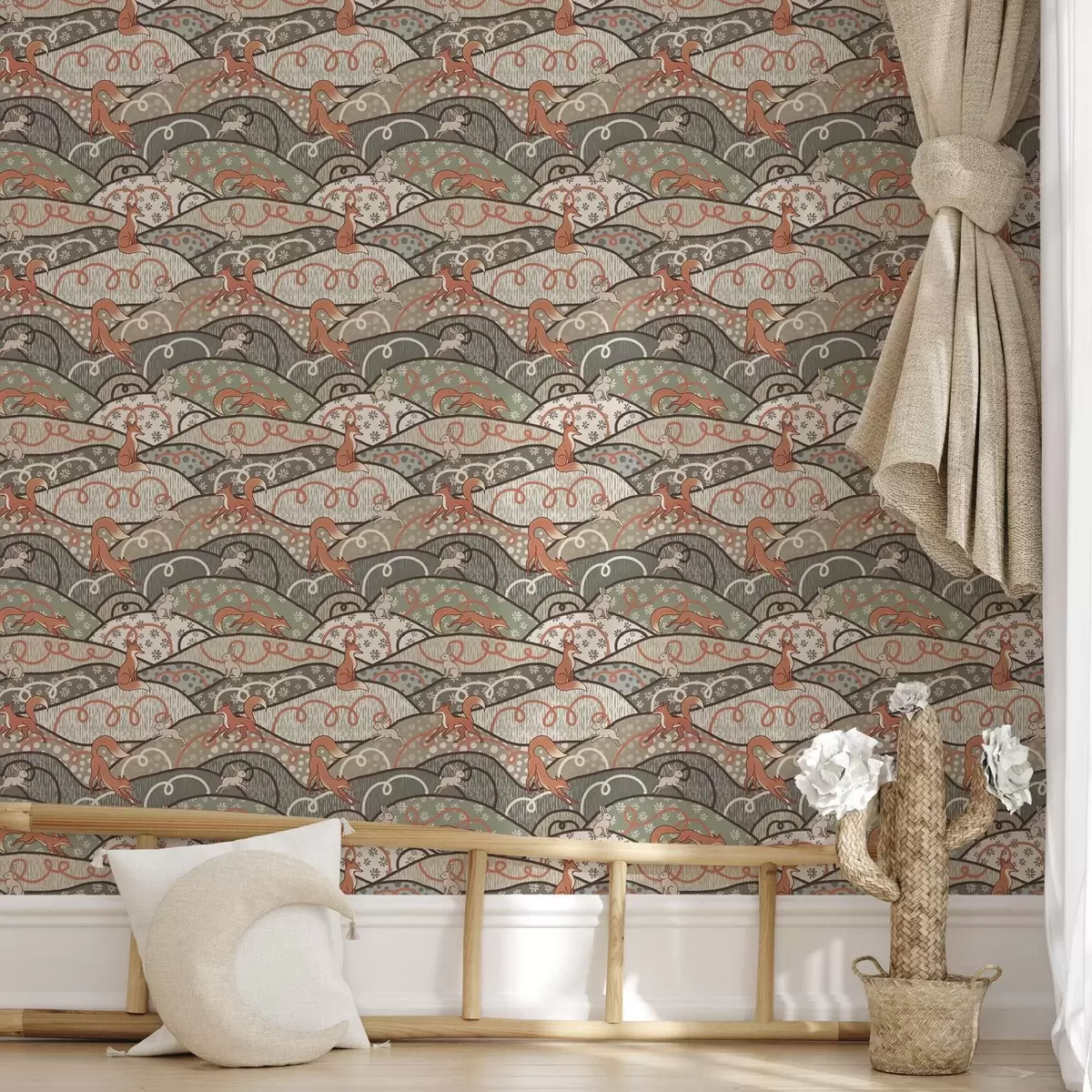 Tapeta Лисице и зечеви на валовитим брдима, ретро узорак бр. a00690