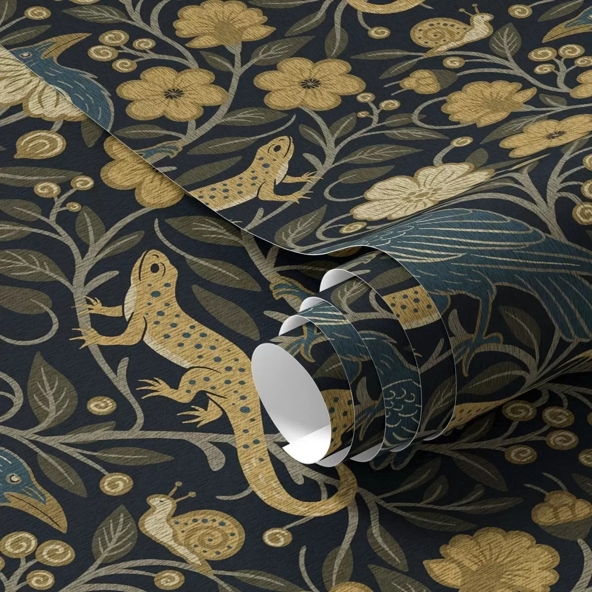 Tapeta Птице, гуштери и пужеви међу цвећем на тамној позадини бр. a00691