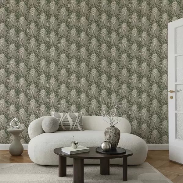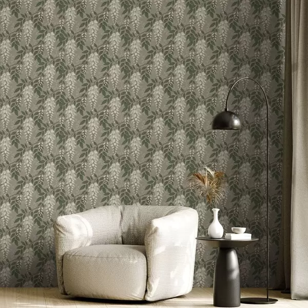 Tapeta Светла глицинија на сиво-маслинастој позадини, каскадни гроздови бр. a00694