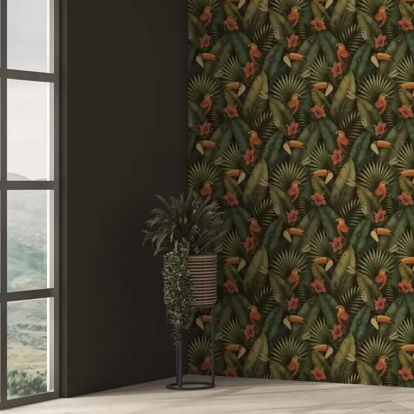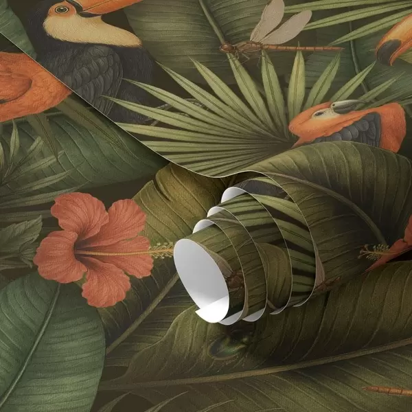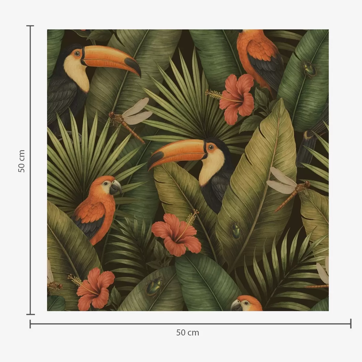 Tapeta Тукан и папагаји међу тропским лишћем и цвећем бр. a00702