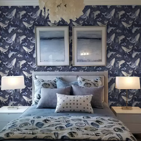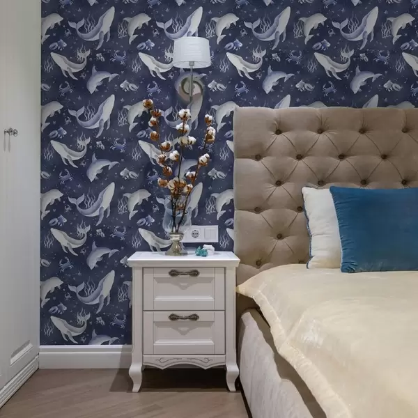 Tapeta Морски китови, делфини и ракови на тамноплавој позадини бр. a00720