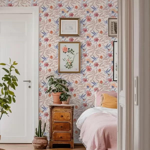 Tapeta Колибрији међу великим цвећем у ружичастим и плавим тоновима бр. a00733