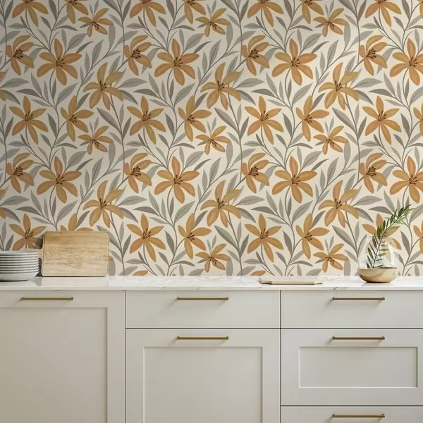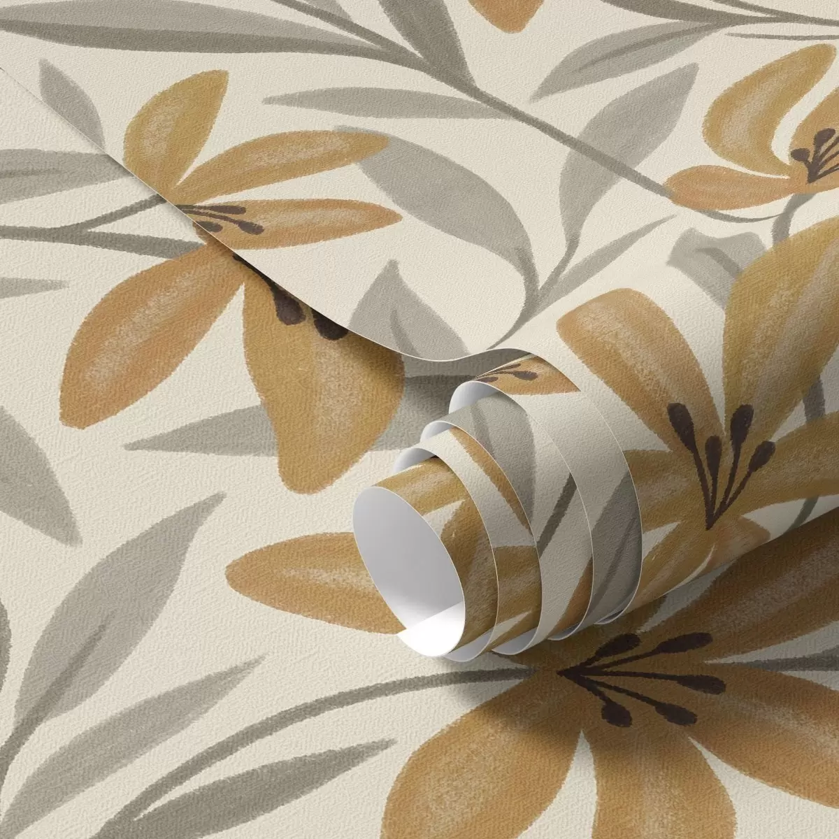 Tapeta Жути љиљани и сиво-зелено лишће на светлој позадини бр. a00757