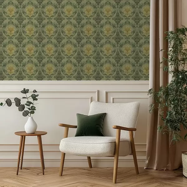 Tapeta Дамаск са биљним спиралама, маслинасто-окер палета бр. a00828