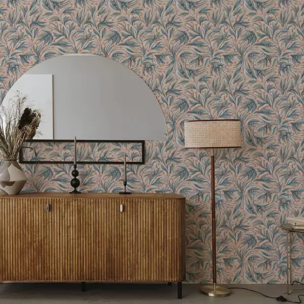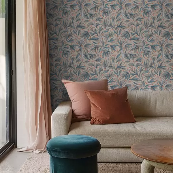 Tapeta Апстрактно плаво лишће са коралним цветовима бр. a00852