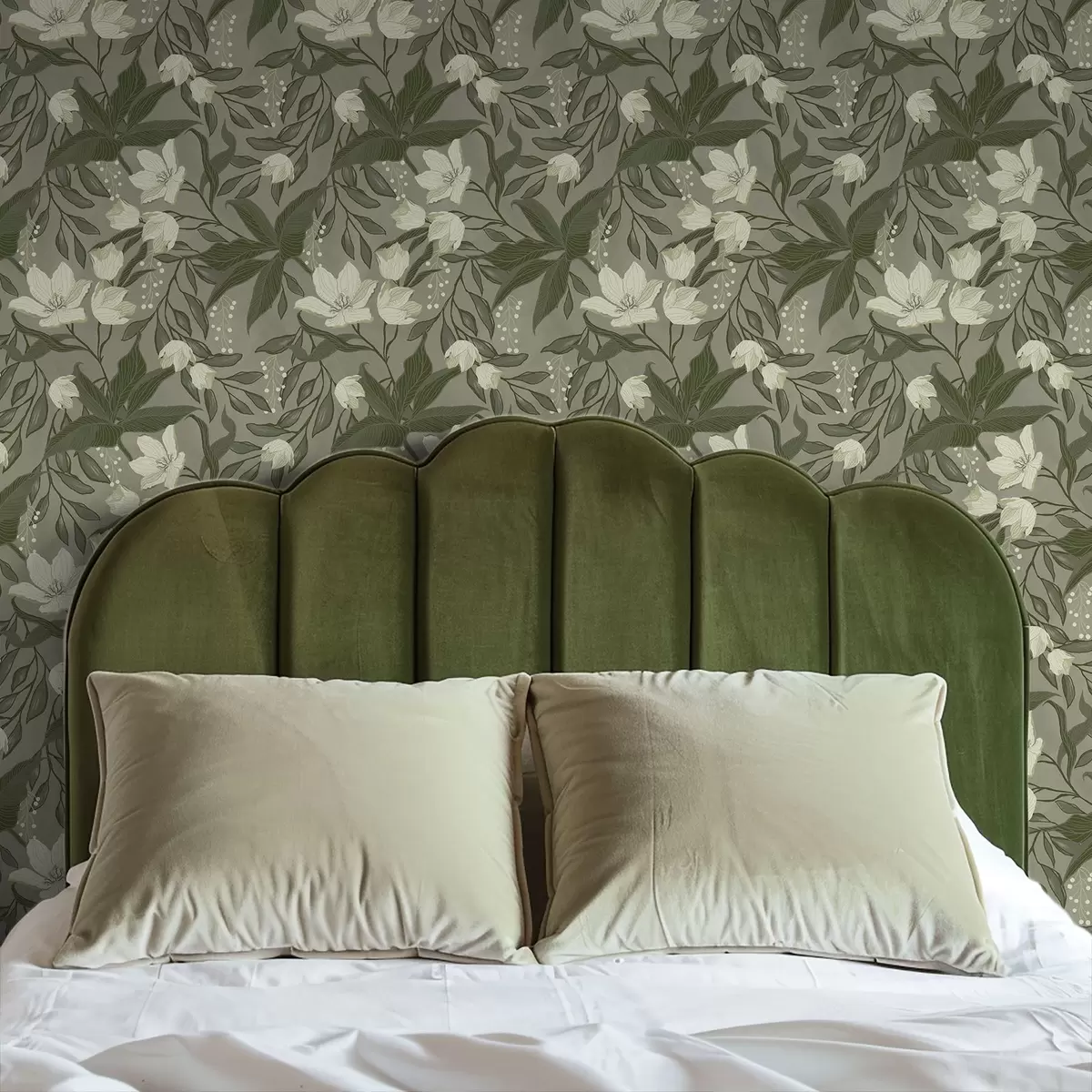 Tapeta Бледи љиљани и лишће на сиво-маслинастој боји бр. a00854