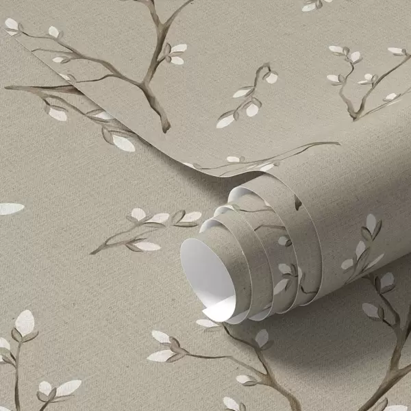 Tapeta Гранчице са белим пупољцима на ланеној тауп позадини бр. a00861