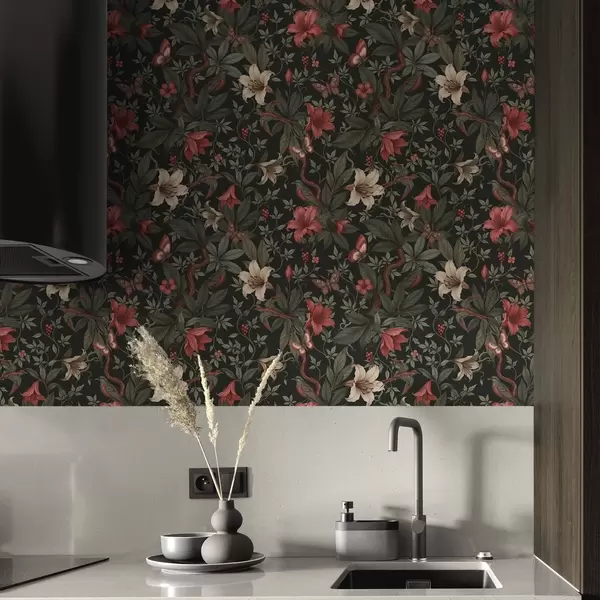 Tapeta Тамни џунгласти цветови са птицама и лептирима бр. a00895