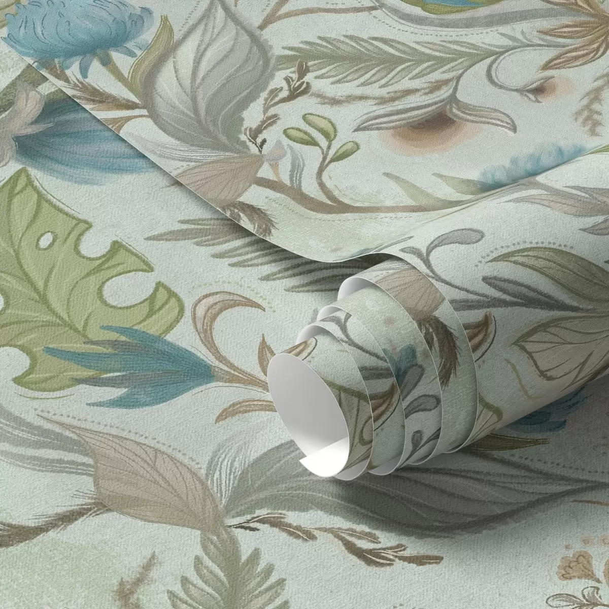 Tapeta Плаво цвеће и зеленило на нежној позадини боје менте бр. a00930v1