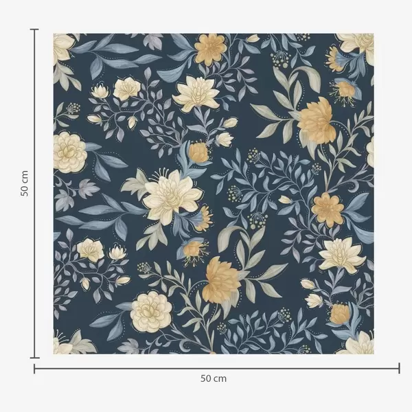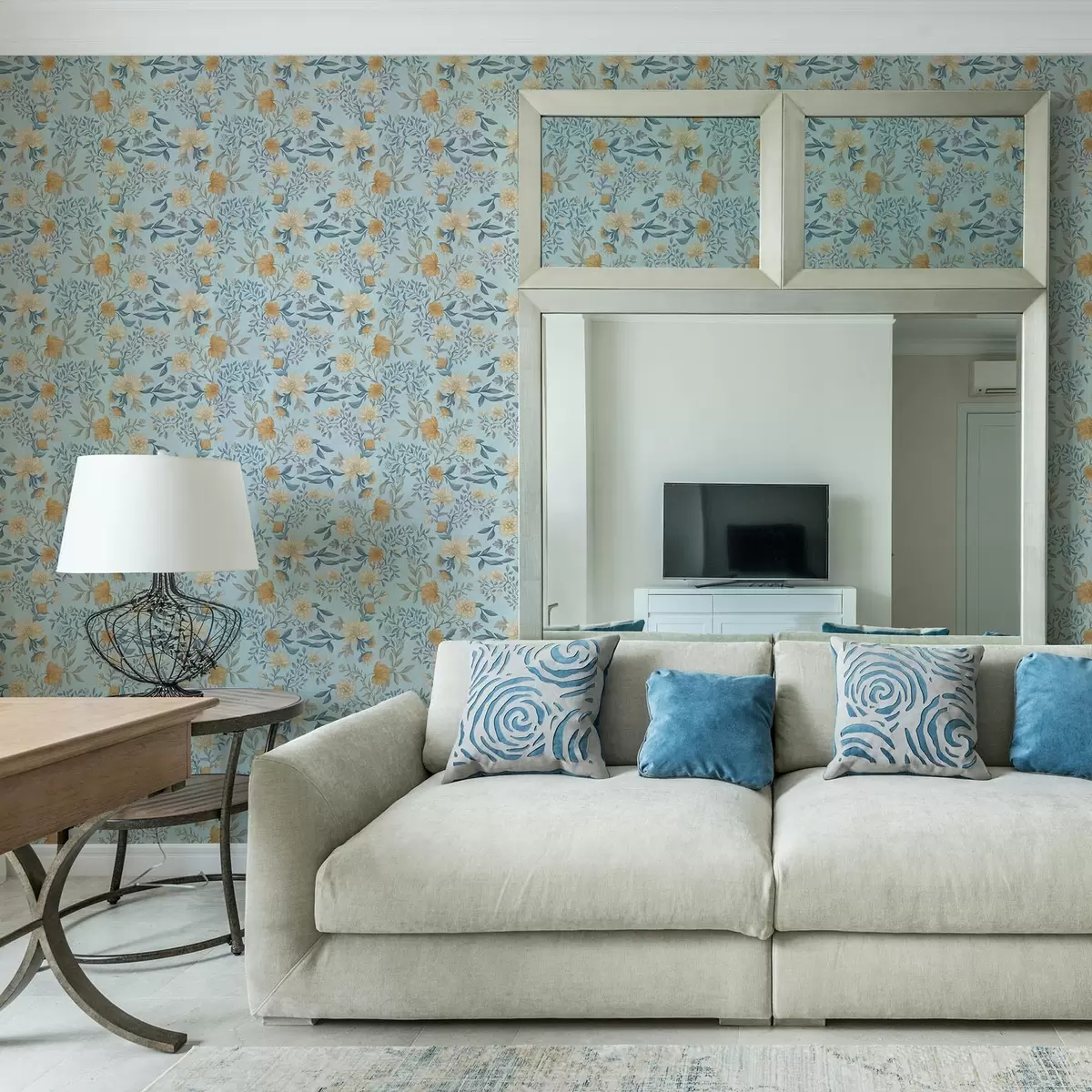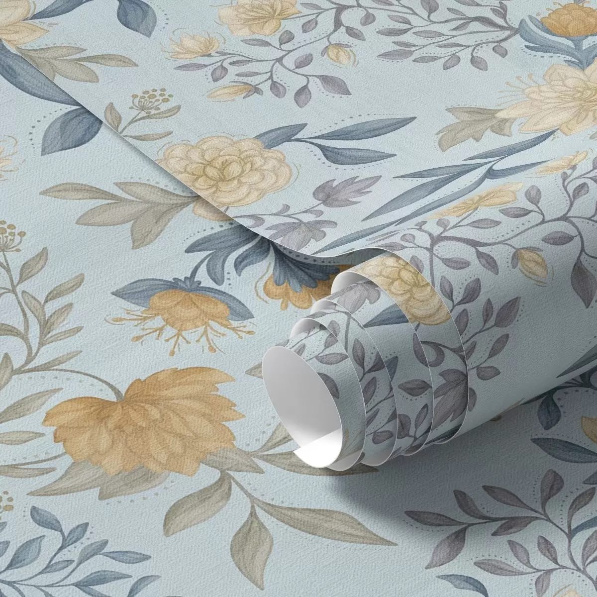 Tapeta Жуто и плаво цвеће са листовима на небеско плавој позадини бр. a00934