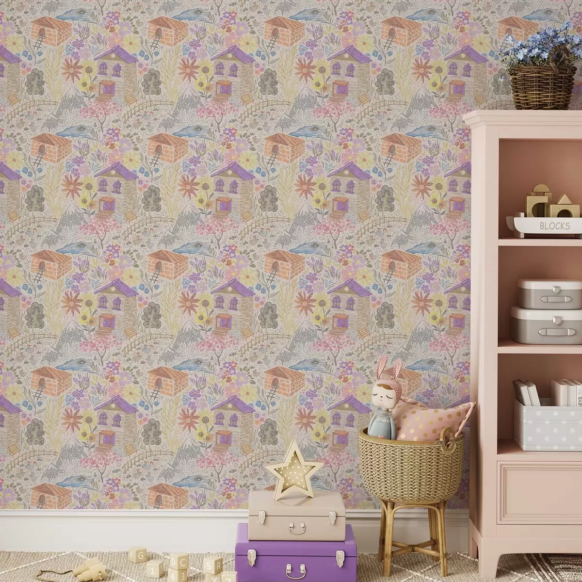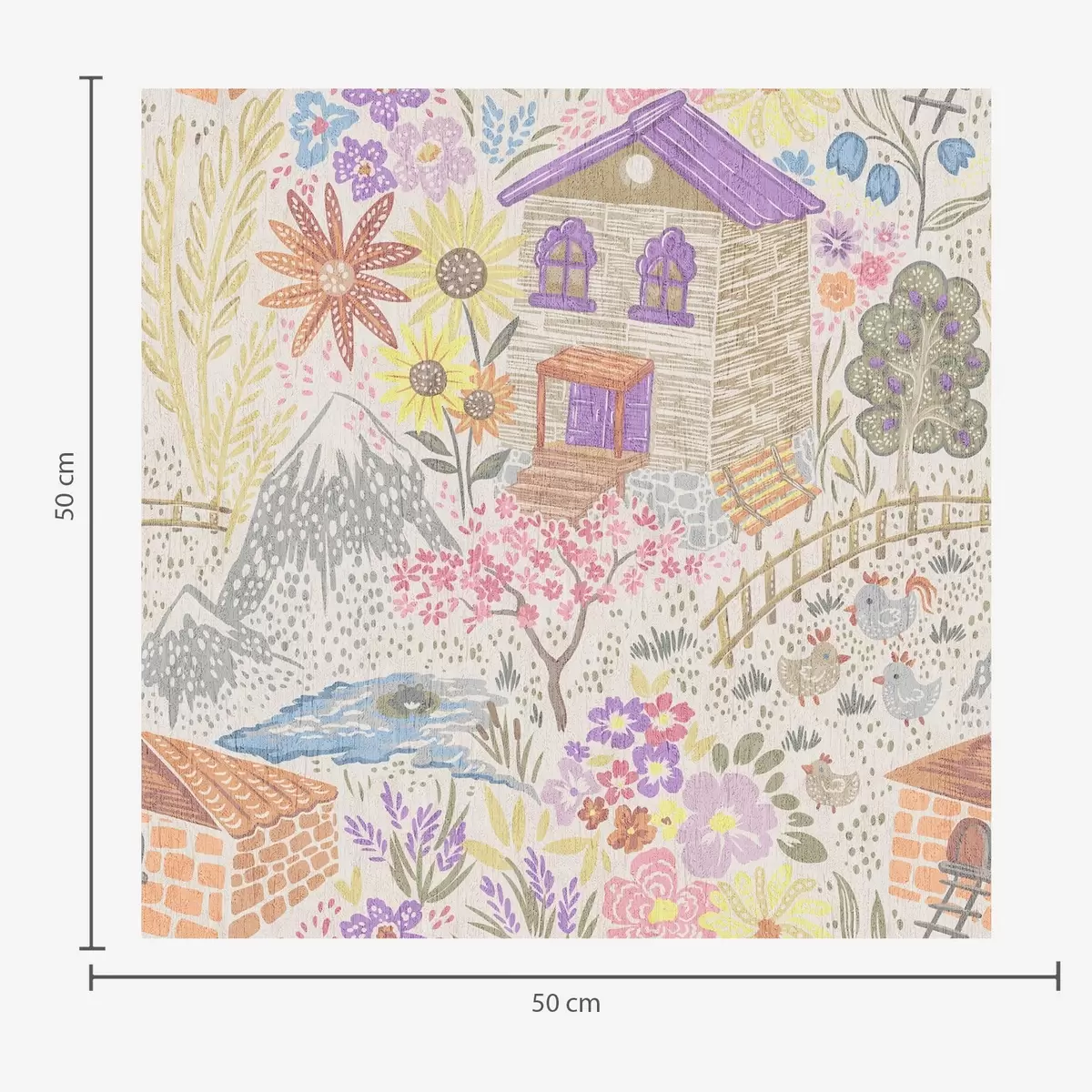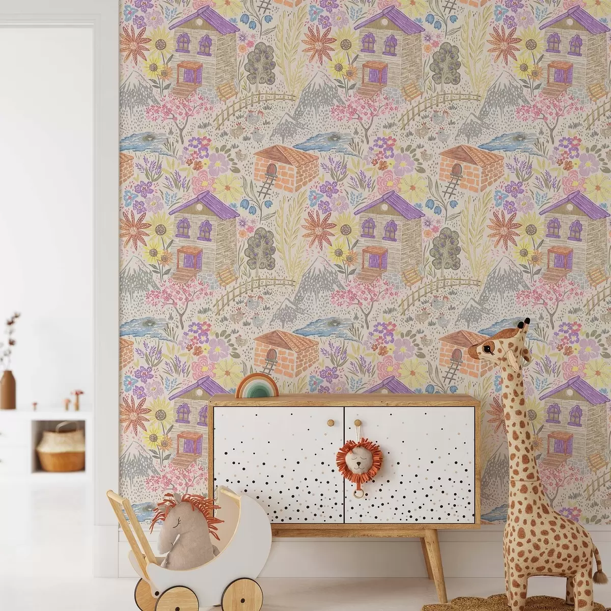 Tapeta Дечји цртеж села са кућом, планинама и цвећем бр. a00952
