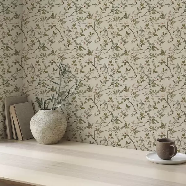 Tapeta Светле гране са ситним кремастим цветовима и зеленим листовима бр. a01028