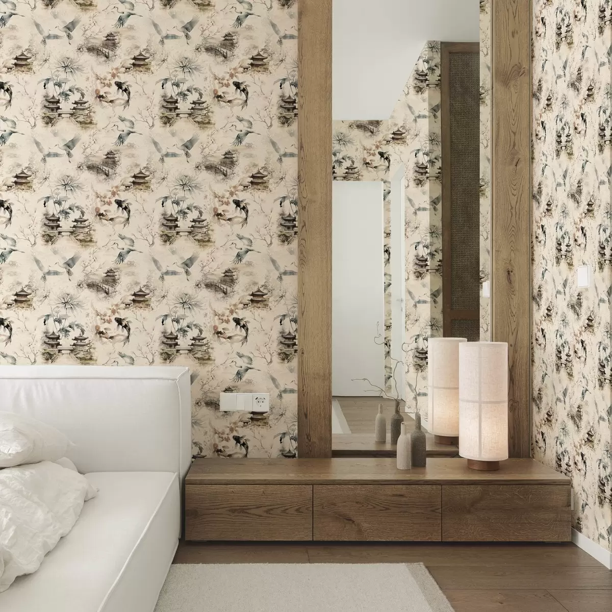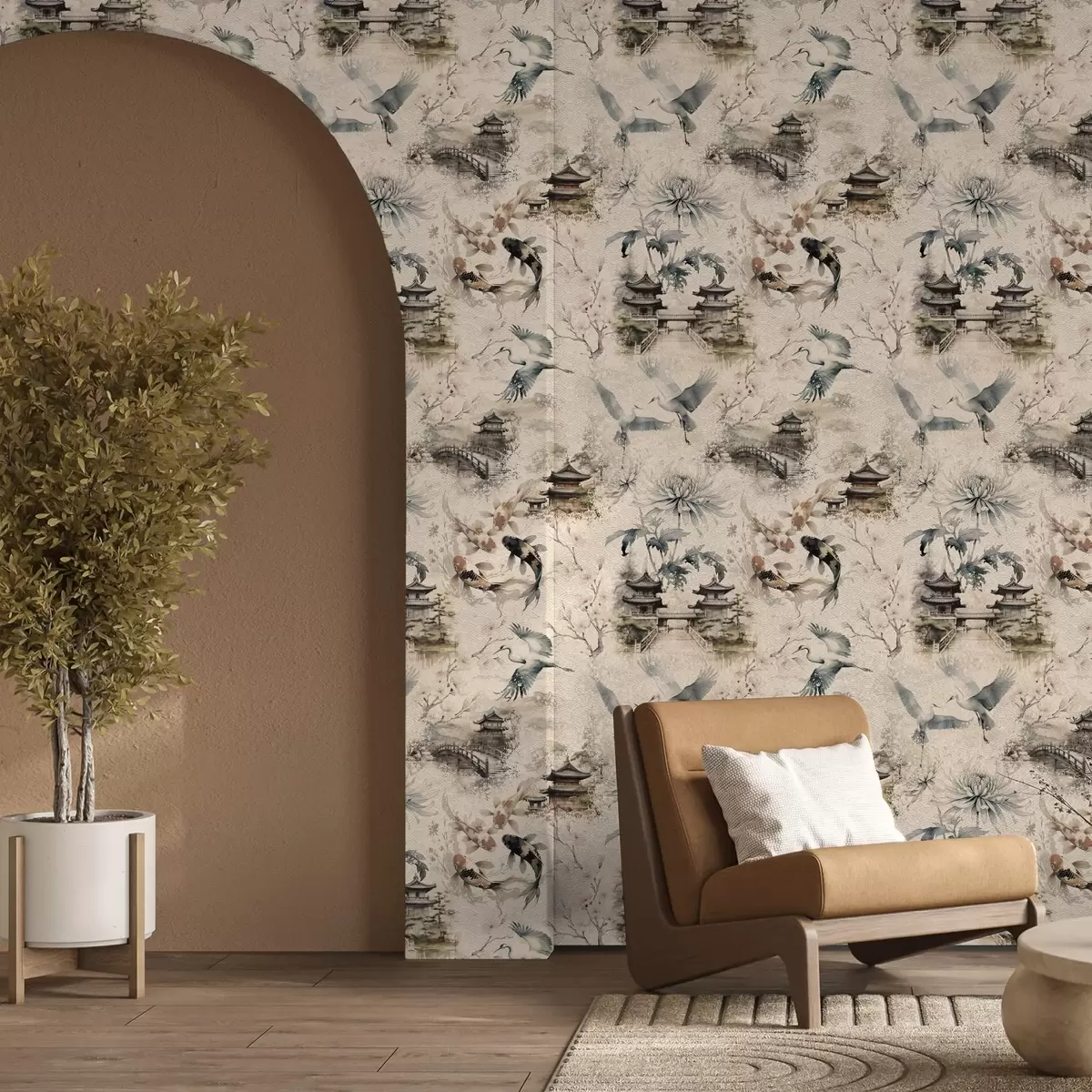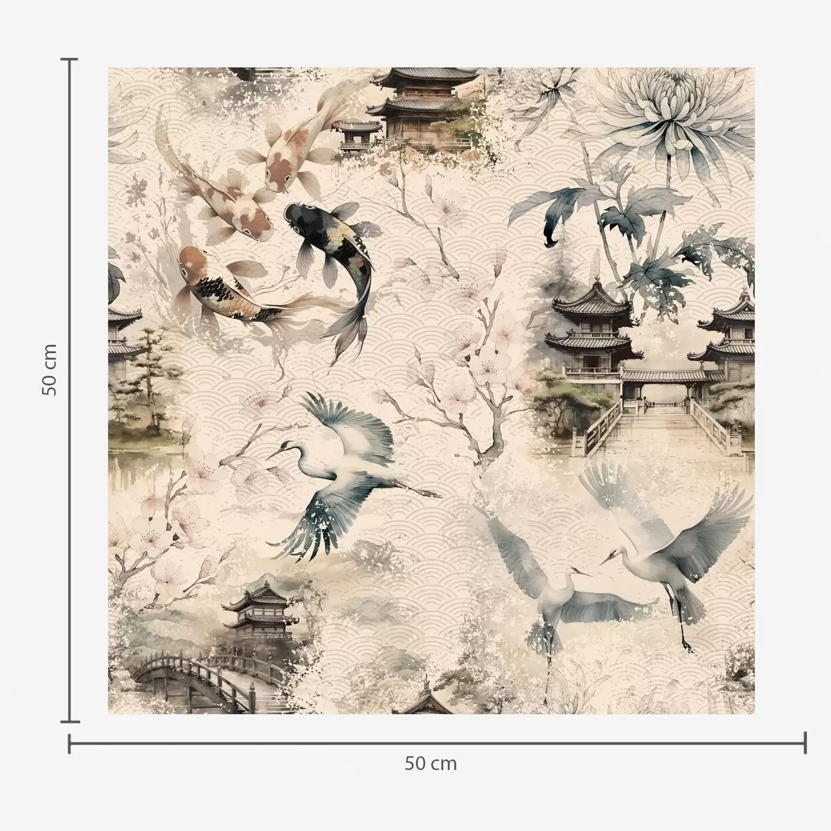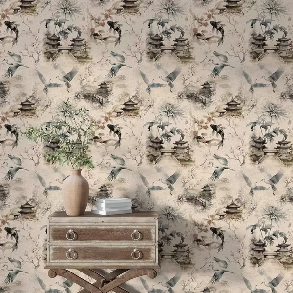 Tapeta Јапански храмови, кои рибе и ждралови на мекој позадини бр. a01040