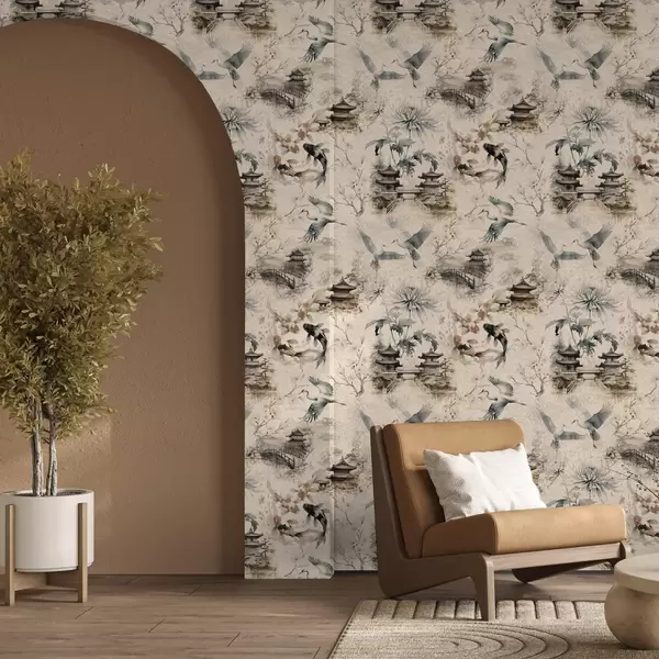 Tapeta Јапански храмови, кои рибе и ждралови на мекој позадини бр. a01040